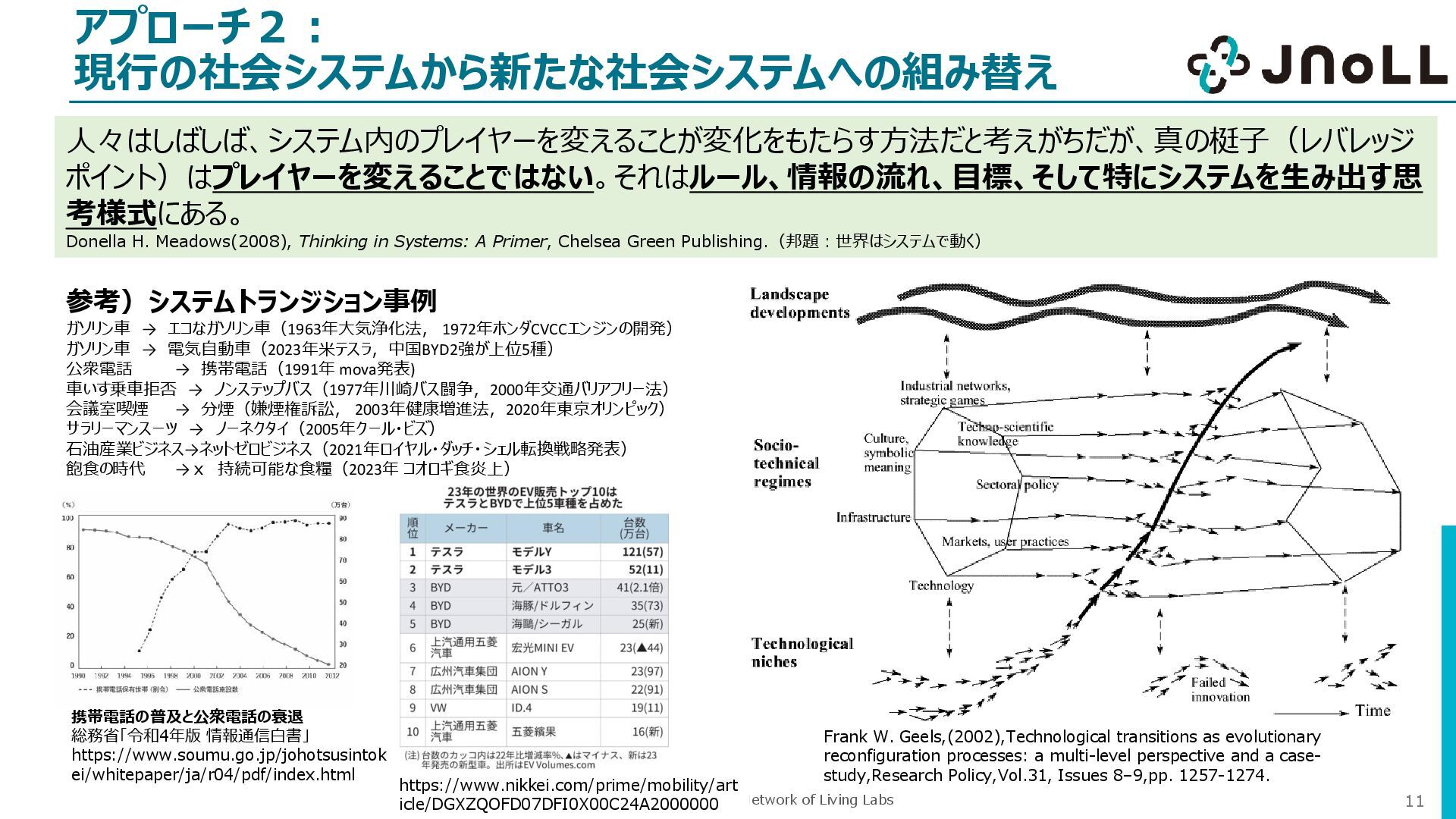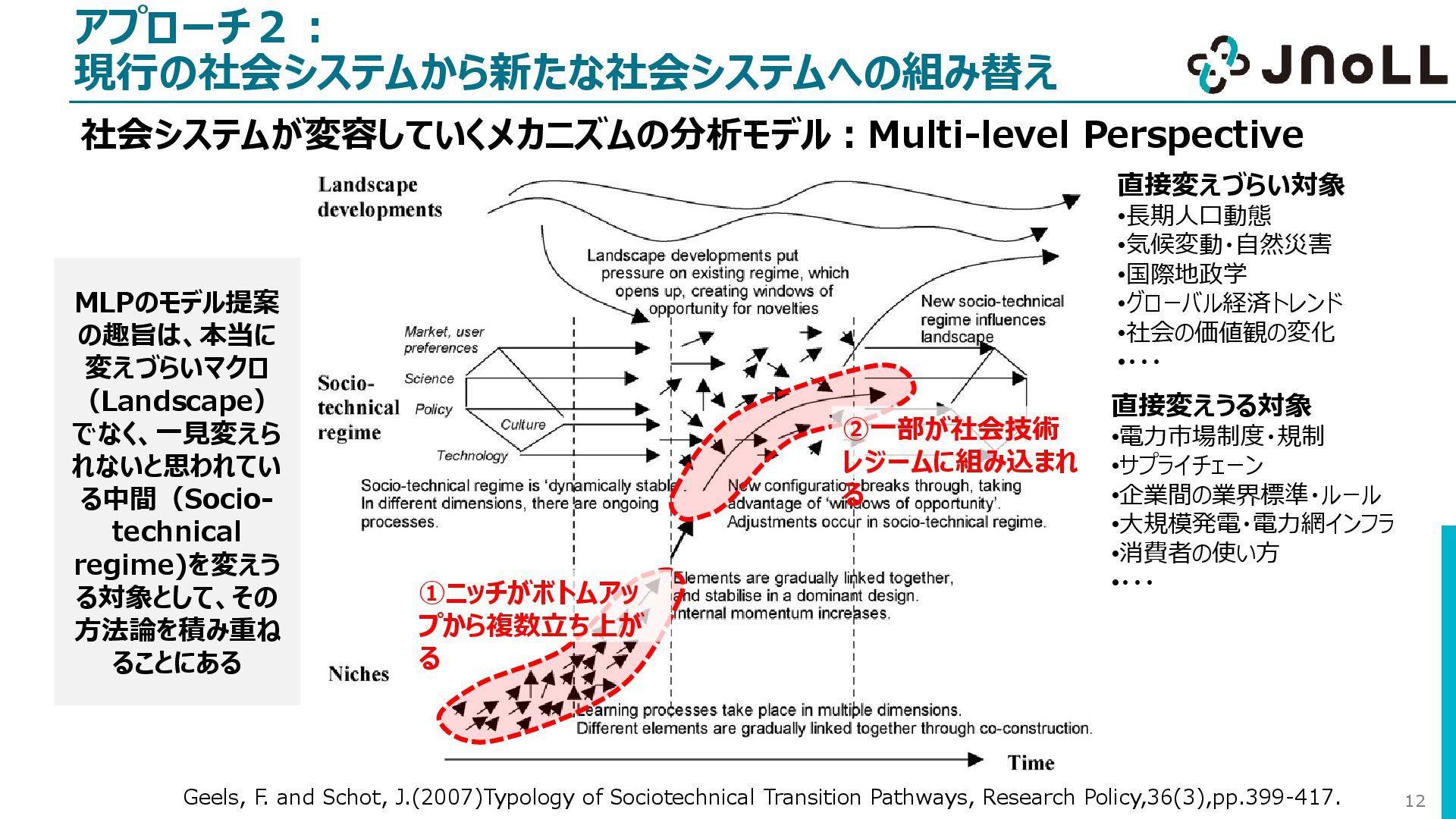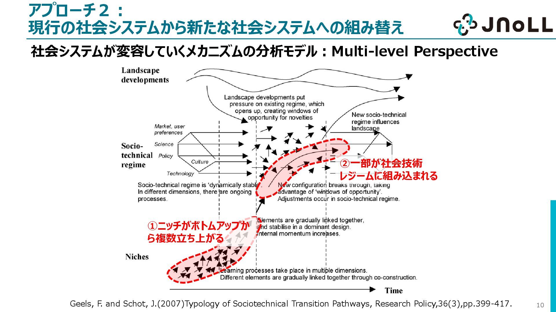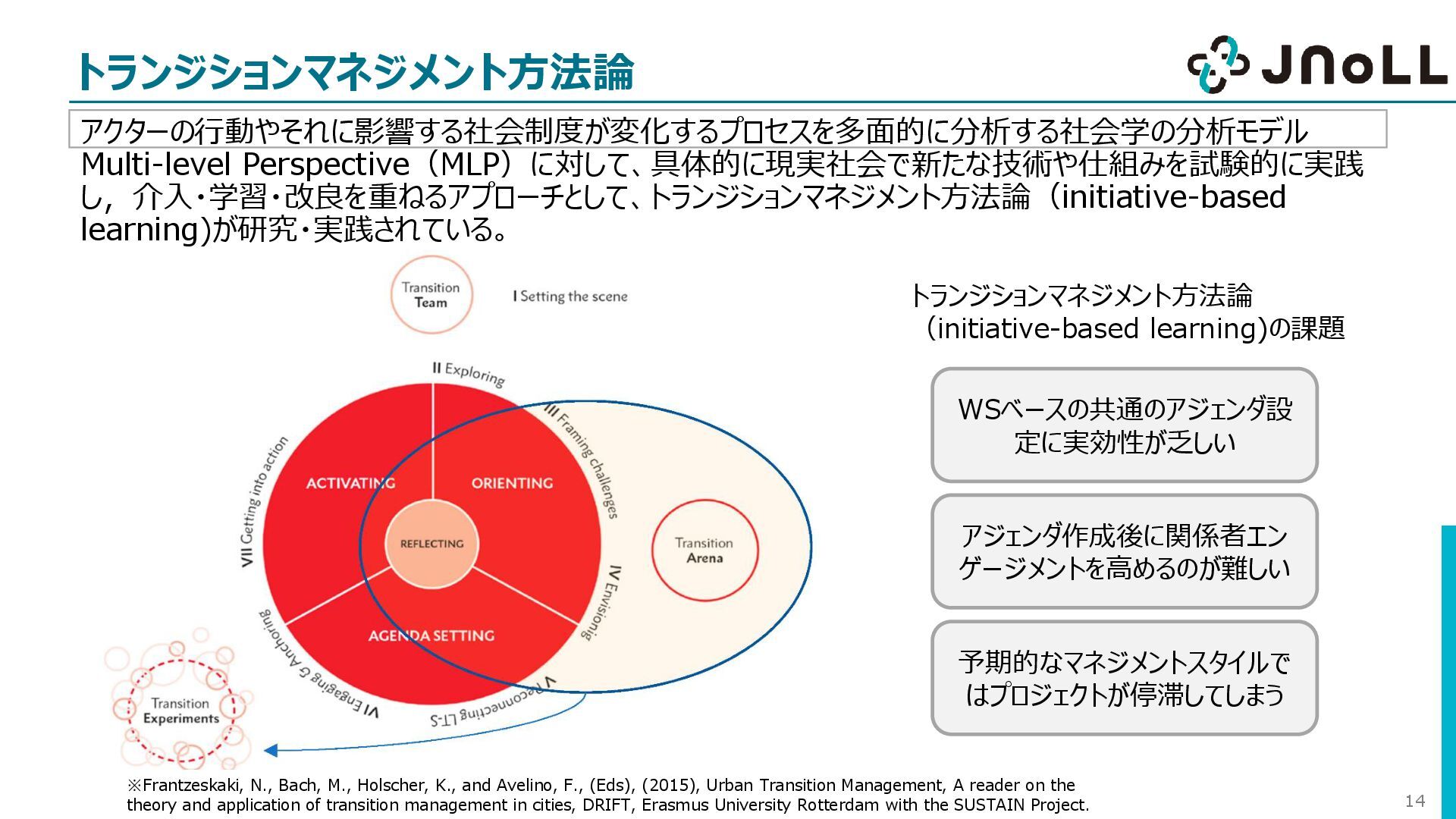 Multi-level Perspective(MLP)に対して、具体的に現実社会で新たな技術や仕組みを試験的に実践 し,介入・学習・改良を重ねるアプローチとして、トランジションマネジメント方法論(initiative-based learning)が研究・実践されている。 WSベースの共通のアジェンダ設 定に実効性が乏しい アジェンダ作成後に関係者エン ゲージメントを⾼めるのが難しい 予期的なマネジメントスタイルで はプロジェクトが停滞してしまう トランジションマネジメント方法論 (initiative-based learning)の課題 ※Frantzeskaki, N., Bach, M., Holscher, K., and Avelino, F., (Eds), (2015), Urban Transition Management, A reader on the theory and application of transition management in cities, DRIFT, Erasmus University Rotterdam with the SUSTAIN Project.