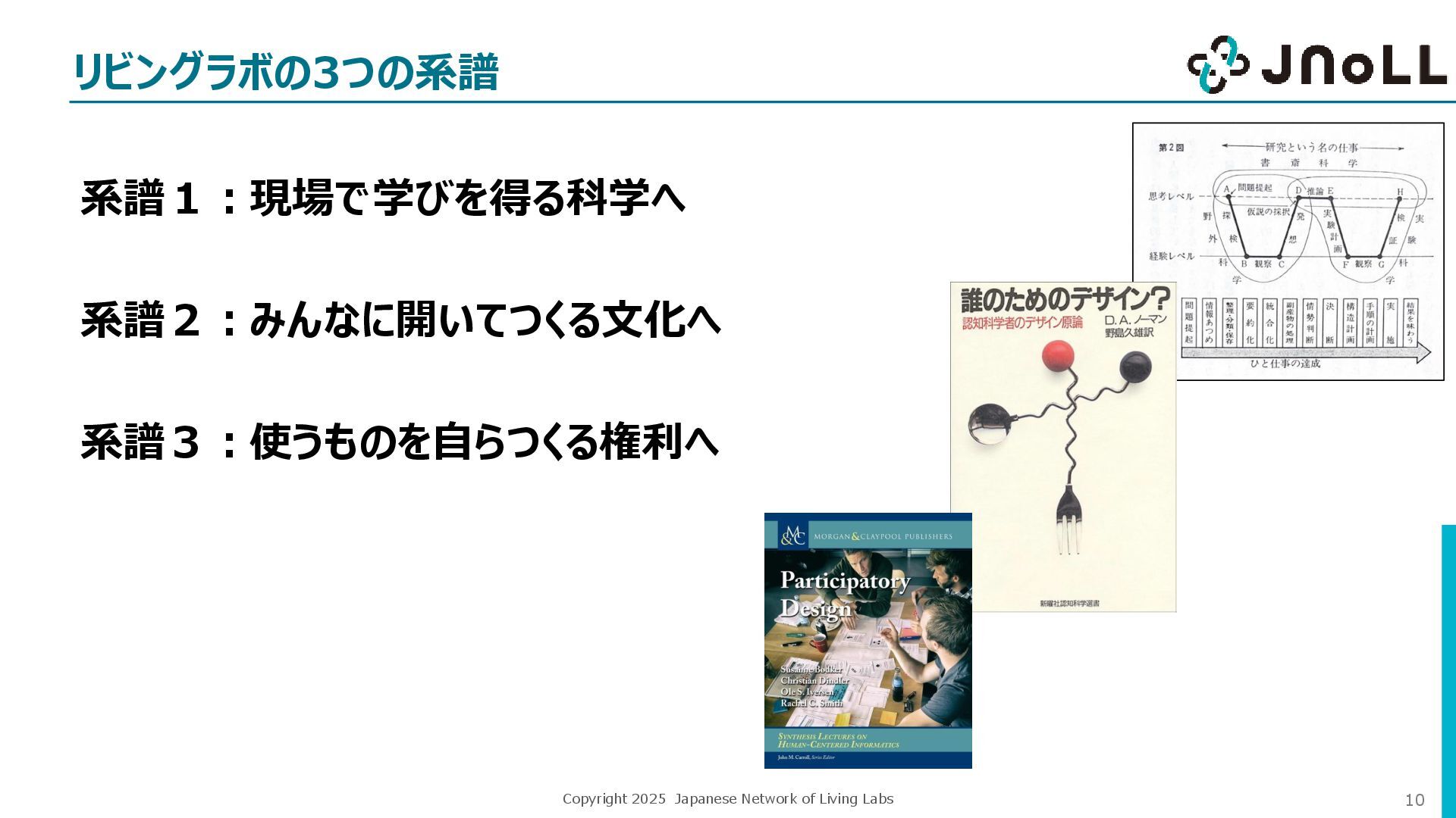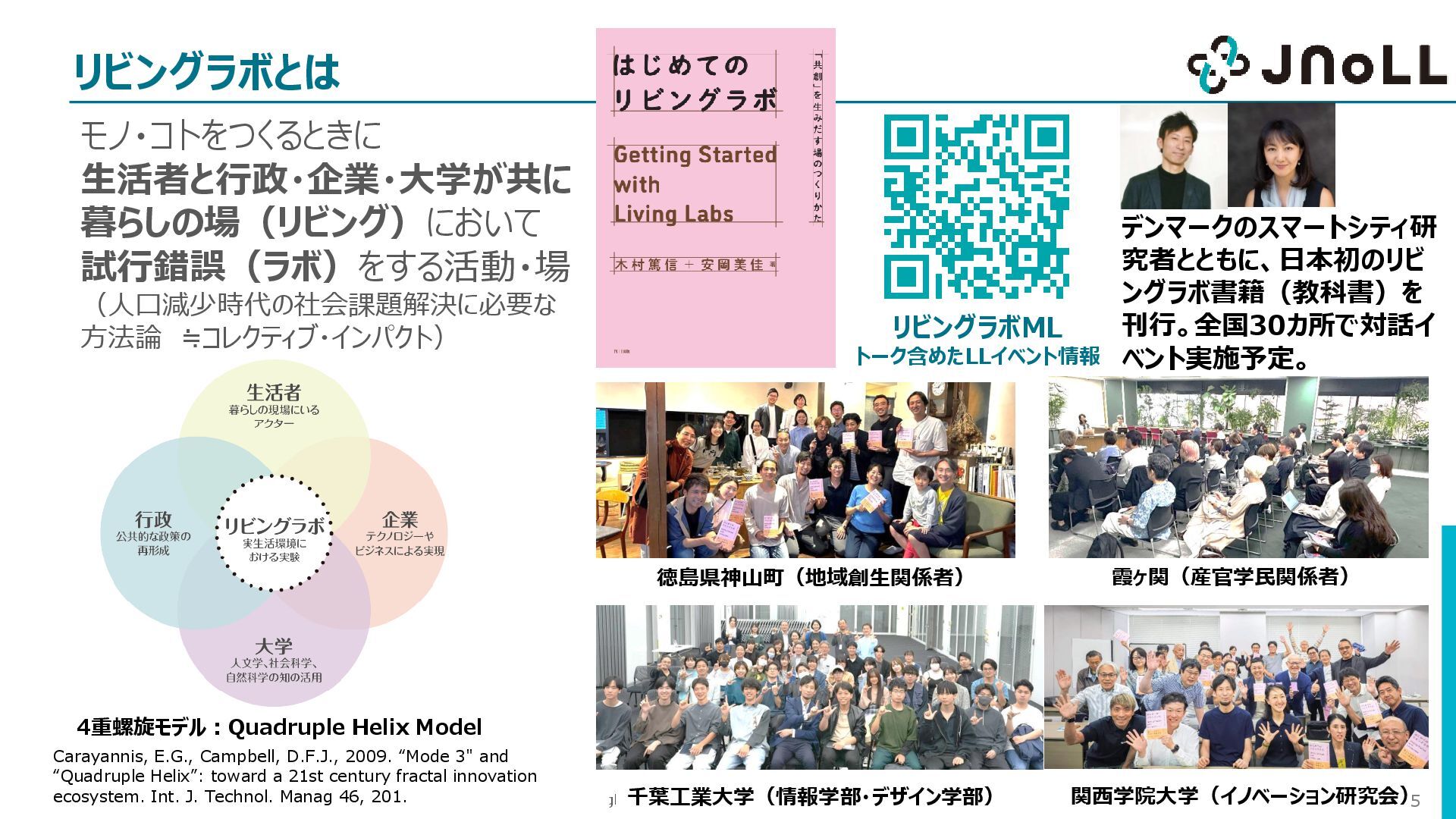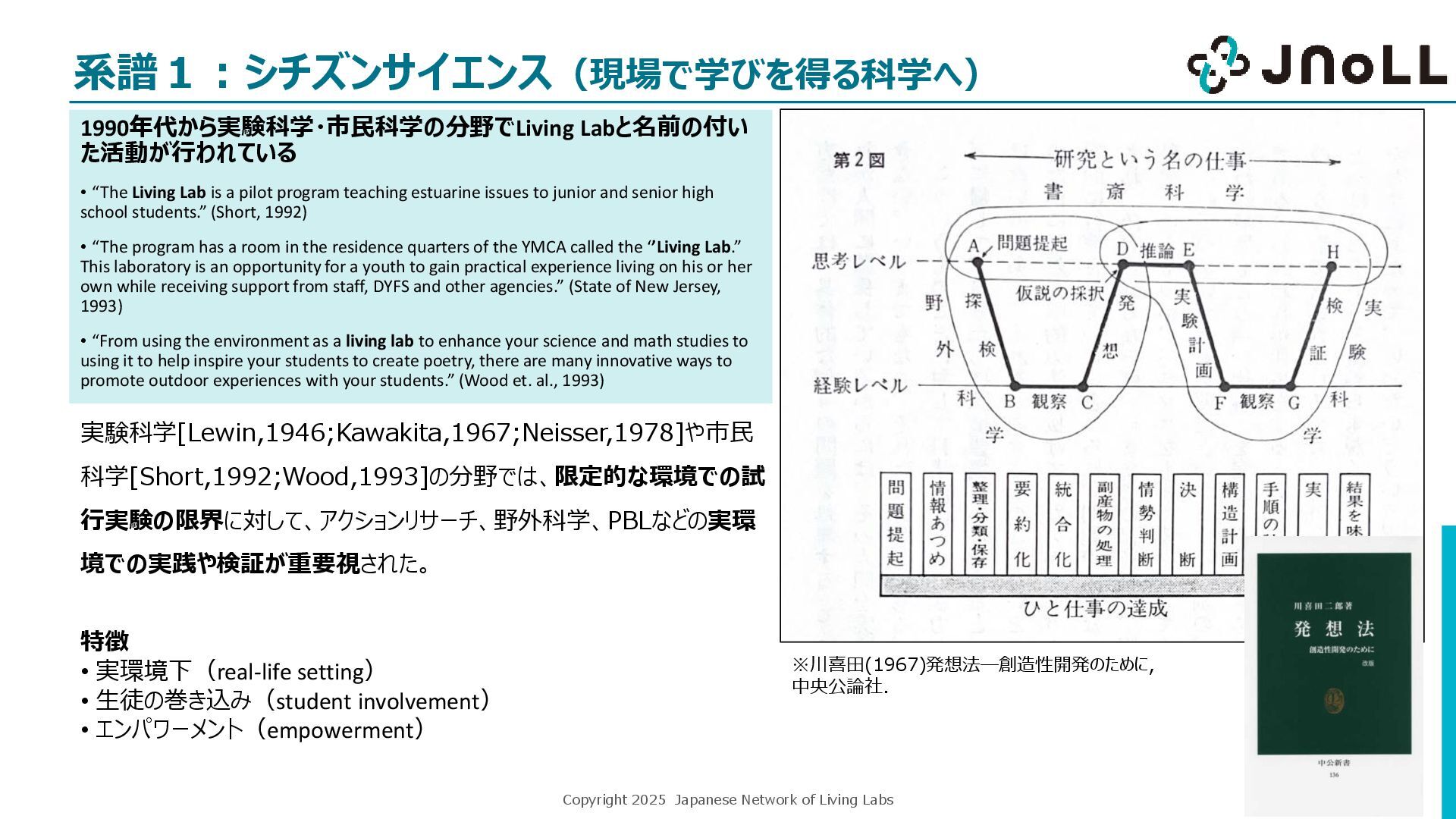 中央公論社. 1990年代から実験科学・市民科学の分野でLiving Labと名前の付い た活動が行われている • “The Living Lab is a pilot program teaching estuarine issues to junior and senior high school students.” (Short, 1992) • “The program has a room in the residence quarters of the YMCA called the ‘’Living Lab.” This laboratory is an opportunity for a youth to gain practical experience living on his or her own while receiving support from staff, DYFS and other agencies.” (State of New Jersey, 1993) • “From using the environment as a living lab to enhance your science and math studies to using it to help inspire your students to create poetry, there are many innovative ways to promote outdoor experiences with your students.” (Wood et. al., 1993) 実験科学[Lewin,1946;Kawakita,1967;Neisser,1978]や市民 科学[Short,1992;Wood,1993]の分野では、限定的な環境での試 行実験の限界に対して、アクションリサーチ、野外科学、PBLなどの実環 境での実践や検証が重要視された。 特徴 • 実環境下(real-life setting) • 生徒の巻き込み(student involvement) • エンパワーメント(empowerment)