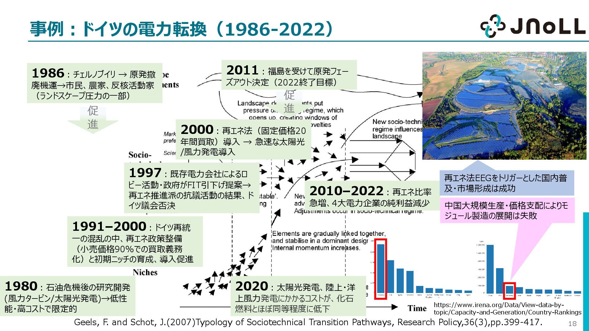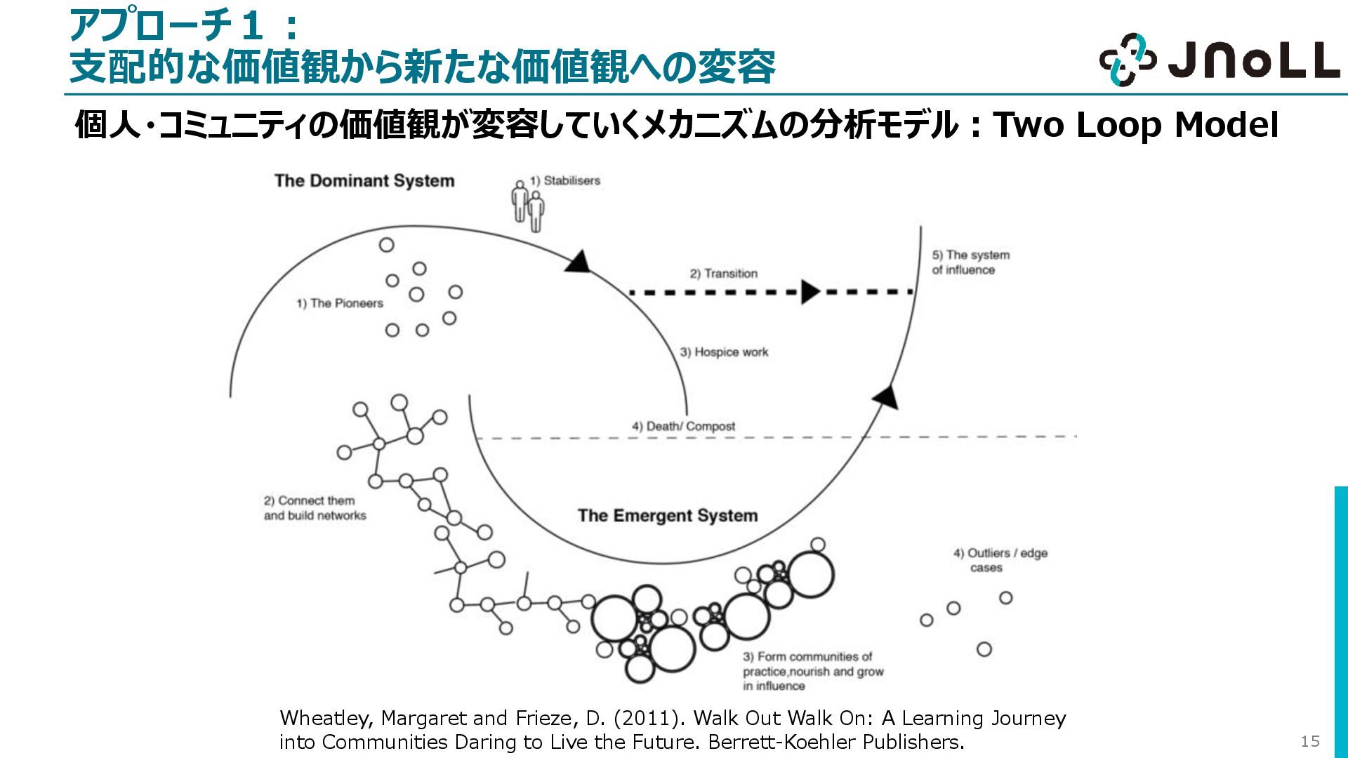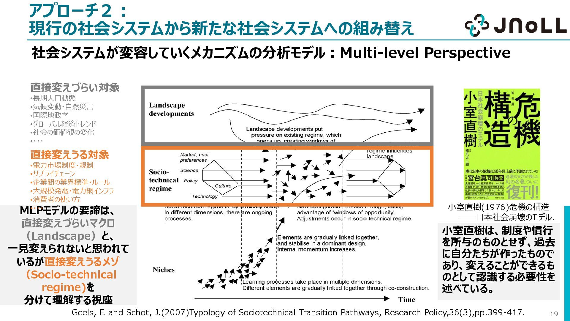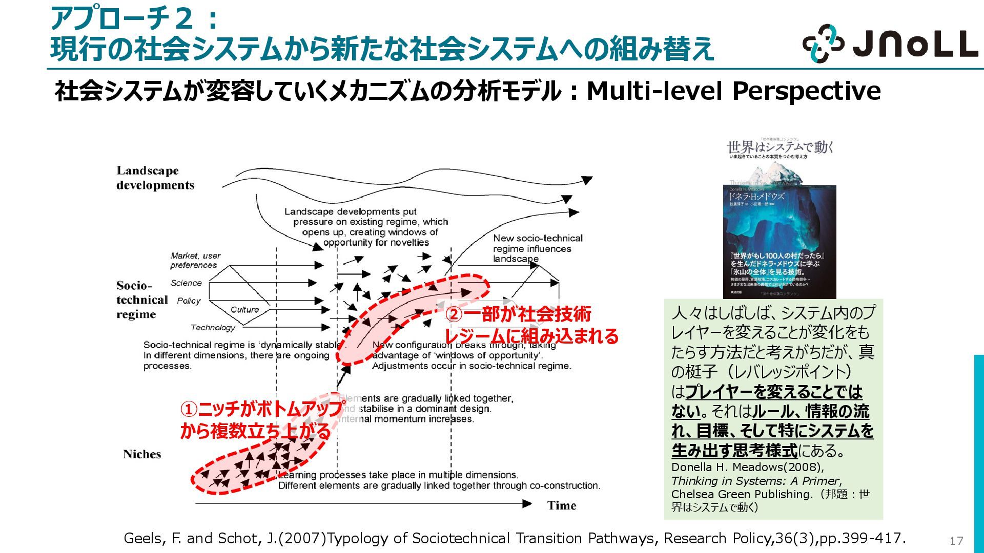 社会システムが変容していくメカニズムの分析モデル:Multi-level Perspective ①ニッチがボトムアップ から複数立ち上がる ②一部が社会技術 レジームに組み込まれる Geels, F. and Schot, J.(2007)Typology of Sociotechnical Transition Pathways, Research Policy,36(3),pp.399-417. 人々はしばしば、システム内のプ レイヤーを変えることが変化をも たらす方法だと考えがちだが、真 の梃子(レバレッジポイント) はプレイヤーを変えることでは ない。それはルール、情報の流 れ、目標、そして特にシステムを 生み出す思考様式にある。 Donella H. Meadows(2008), Thinking in Systems: A Primer, Chelsea Green Publishing.(邦題:世 界はシステムで動く)