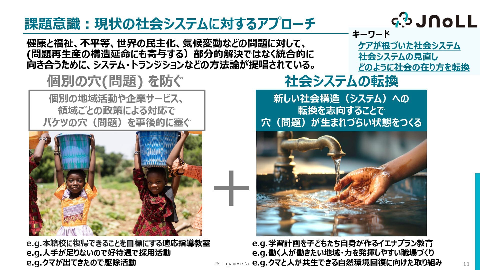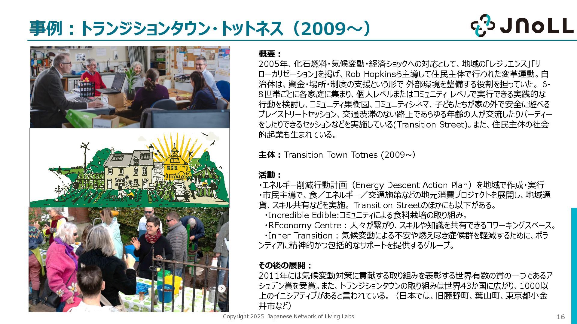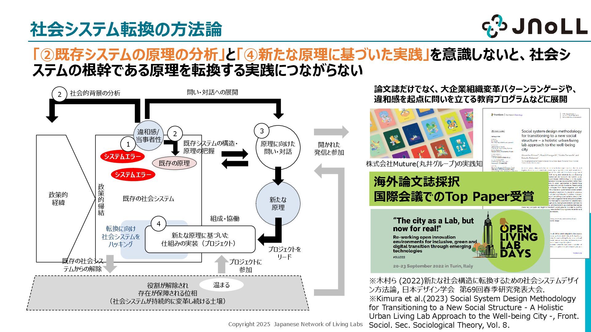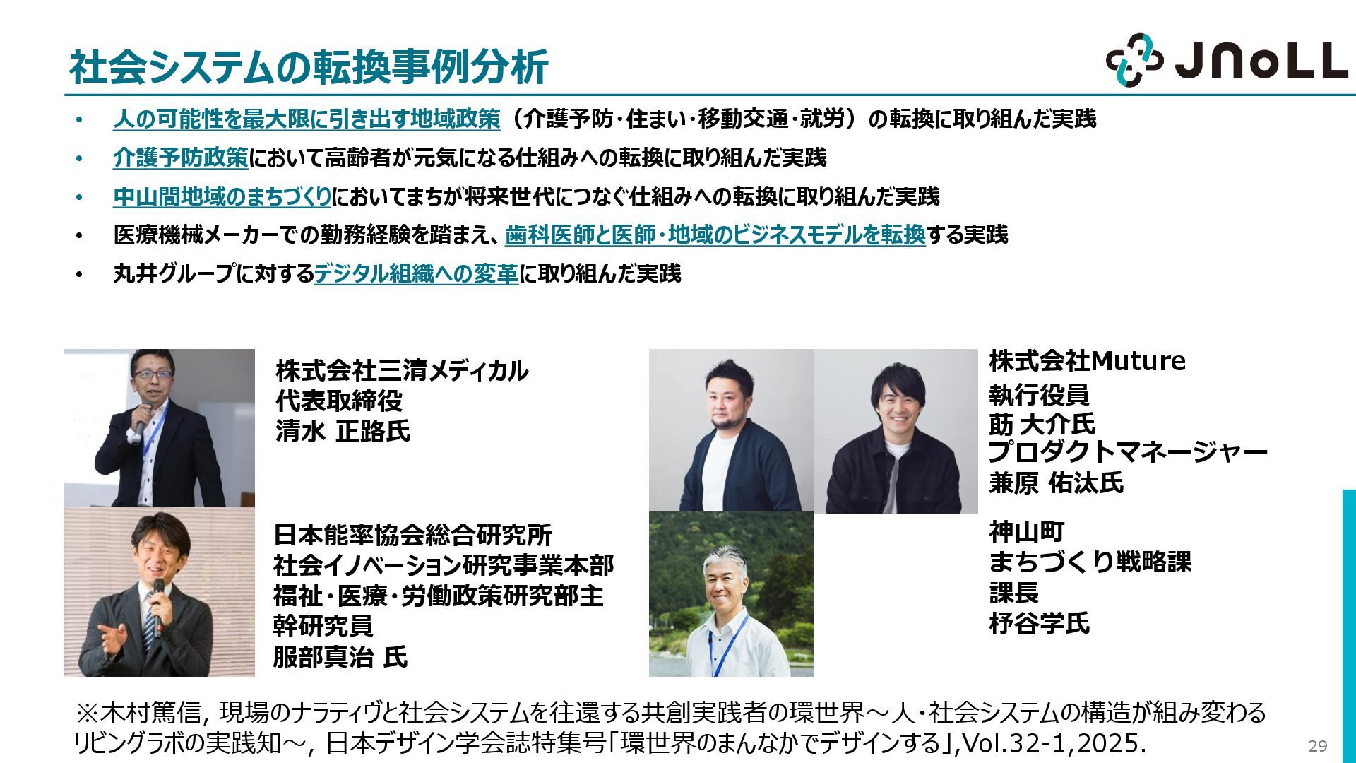 社会システムが変容していくメカニズムの分析モデル:Multi-level Perspective ①ニッチがボトムアップ から複数立ち上がる ②一部が社会技術 レジームに組み込まれる Geels, F. and Schot, J.(2007)Typology of Sociotechnical Transition Pathways, Research Policy,36(3),pp.399-417. 人々はしばしば、システム内のプ レイヤーを変えることが変化をも たらす方法だと考えがちだが、真 の梃子(レバレッジポイント) はプレイヤーを変えることでは ない。それはルール、情報の流 れ、目標、そして特にシステムを 生み出す思考様式にある。 Donella H. Meadows(2008), Thinking in Systems: A Primer, Chelsea Green Publishing.(邦題:世 界はシステムで動く)
