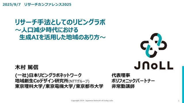 1. 1 Copyright 2024 Japanese Network of Living Labs 木村 篤信