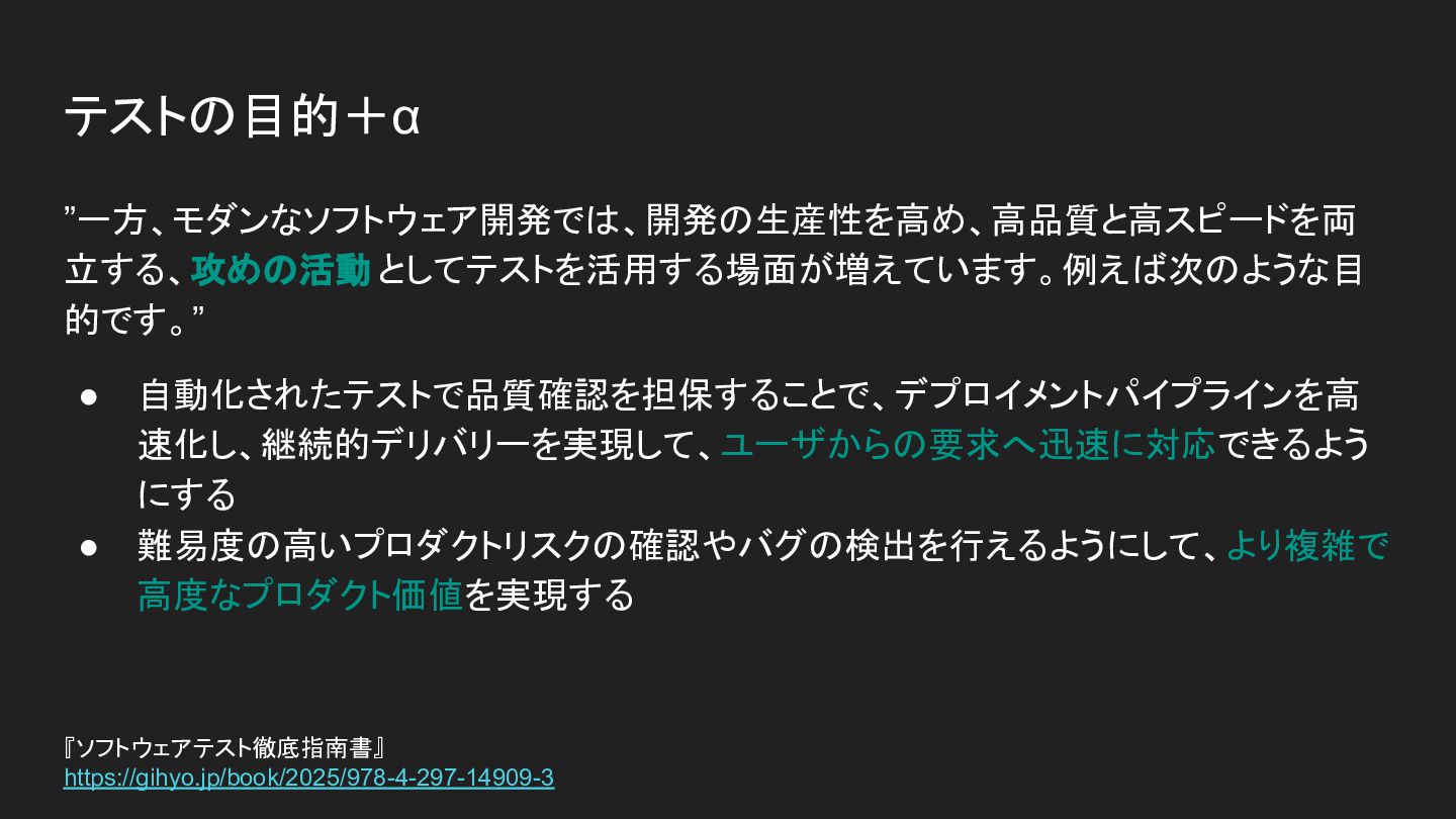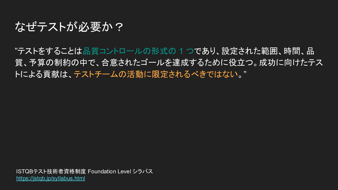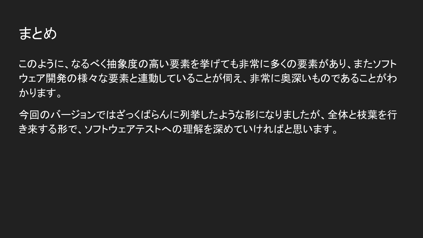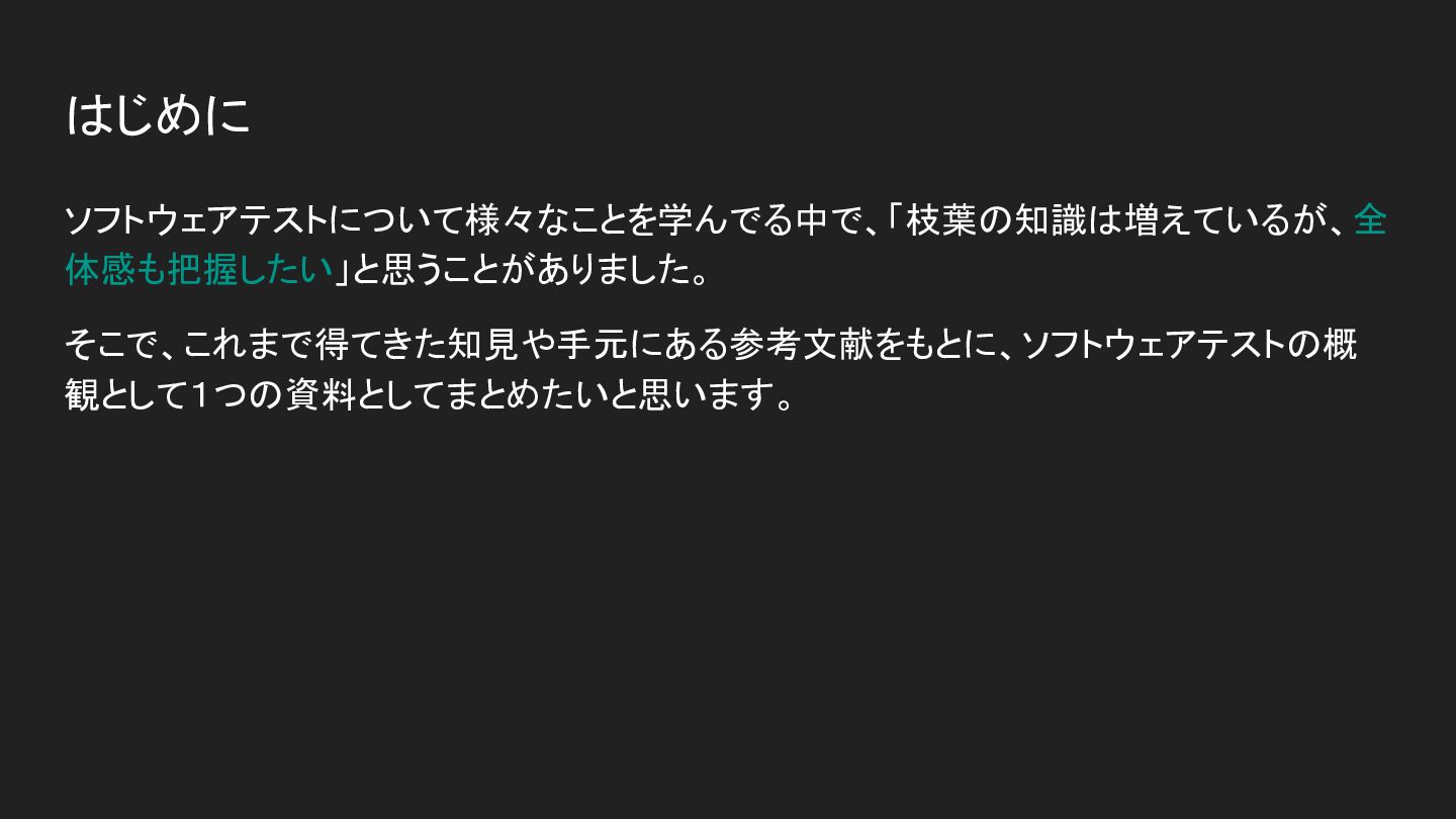 ソフトウェアテストについて様々なことを学んでる中で、「枝葉の知識は増えているが、全体感も把握したい」と思うことがありました。 そこで、これまで得てきた知見や手元にある参考文献をもとに、ソフトウェアテストの概観として1つの資料としてまとめたいと思います。