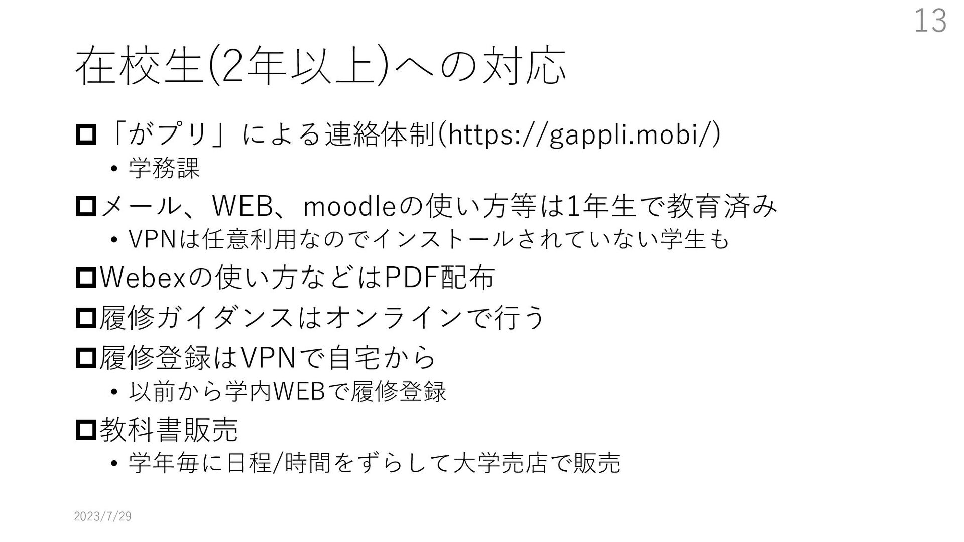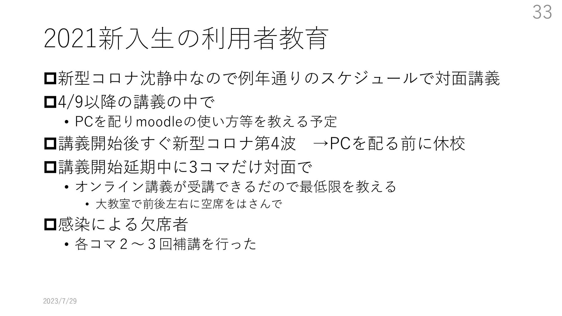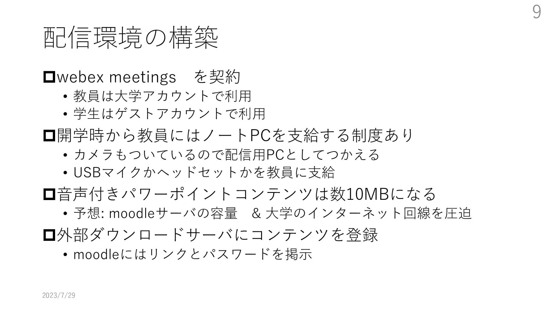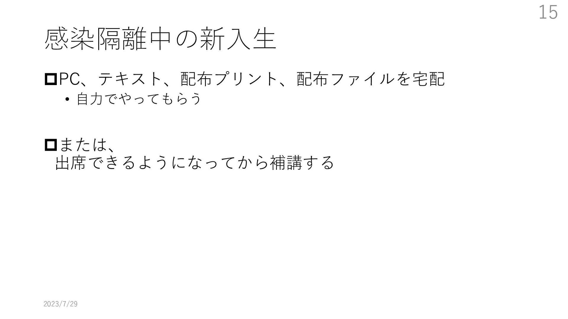 教員大学側がどのように配信するか、視聴に必要な技能を学生にどう教えるかなどの課題にどのように取り組んだかを述べる。特に大学のIT環境を使用する方法の教育をまだ受けていない新入生をどうするかが最も大きな課題となった。