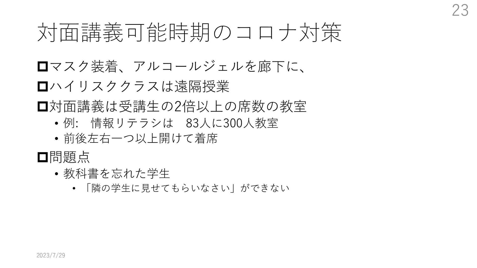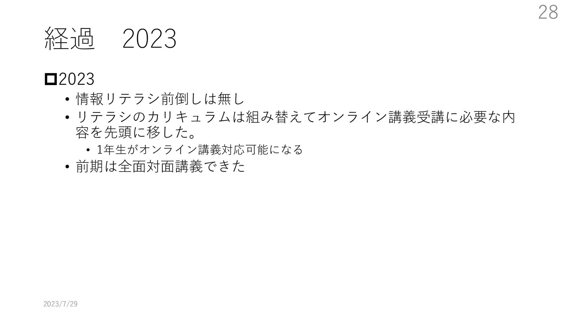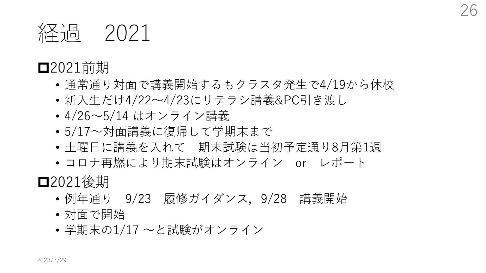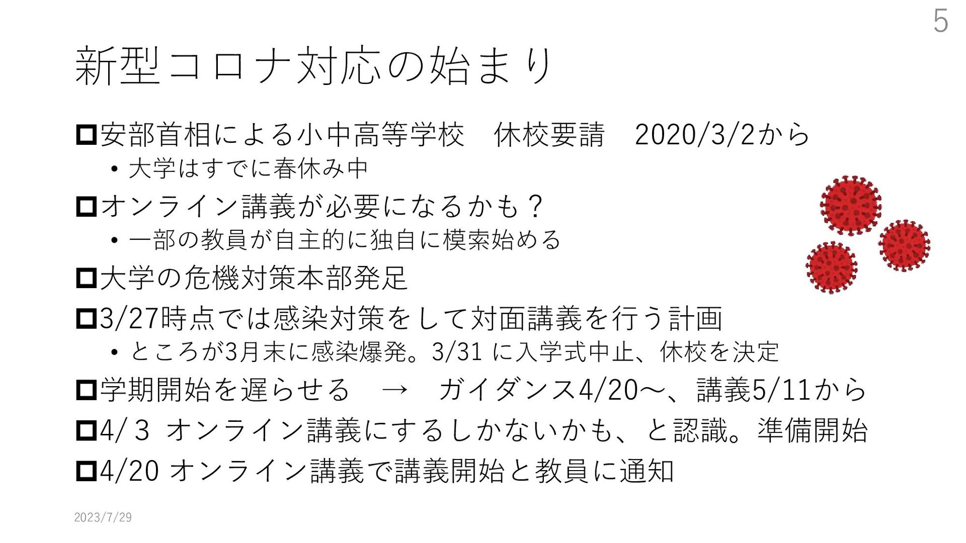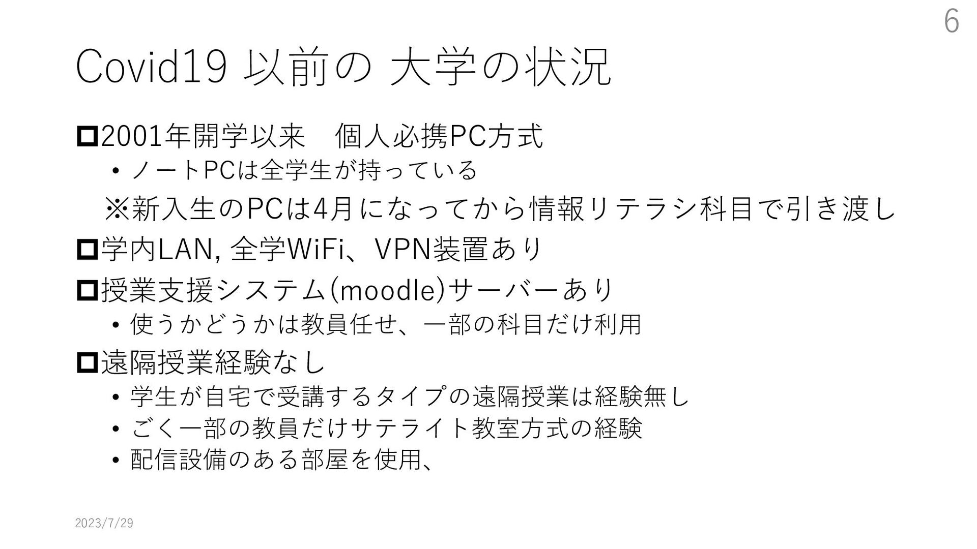 教員大学側がどのように配信するか、視聴に必要な技能を学生にどう教えるかなどの課題にどのように取り組んだかを述べる。特に大学のIT環境を使用する方法の教育をまだ受けていない新入生をどうするかが最も大きな課題となった。