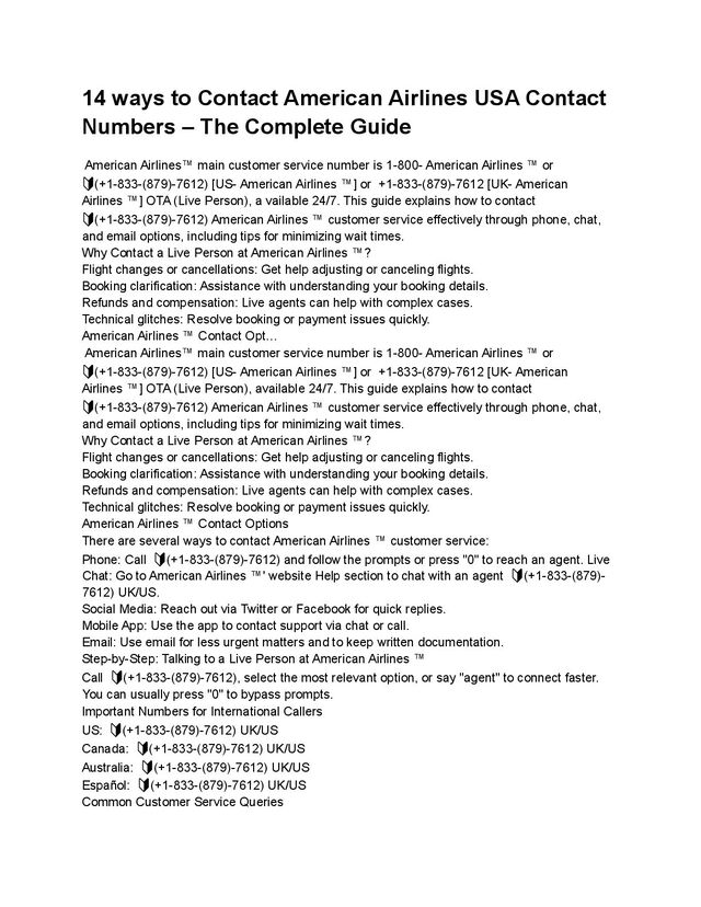 American™️ Airlines®️ official customer service number is 🔰̳1-833-(879)-7612 , where you can speak directly to a live representative any time of the day. Whether you’re facing flight issues, hotel changes, cancellations, or need help with a refund, this guide gives you all the ways to connect with American™️ Airlines®️ quickly and easily.
