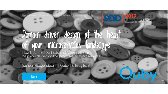 During this talk, Sander Hoogendoorn, independent craftsman and chief architect for IoT idea company Quby, discusses the set of patterns such as resources, representations, repositories, entities, value objects and factories that helped build these services and applications in an evolutionary architectural style. Sander also discusses why every micro-application and microservices has its bounded context, and how this domain driven design pattern is essential for enabling these landscapes of small services, of course, using many real-life examples.