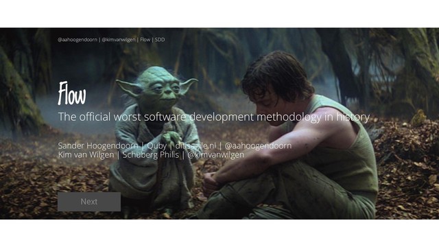 During this talk, Kim and Sander will feal with Flow: the worst software development methodology in the history ever, taking inspiration from the worst principles and practices from methodologies such as waterfall, RUP, Scrum, Kanban, Lean, BDD, LeSS , SAFe, Spotify and of course everything continuous. Don't let project failure take you by surprise, be certain!
