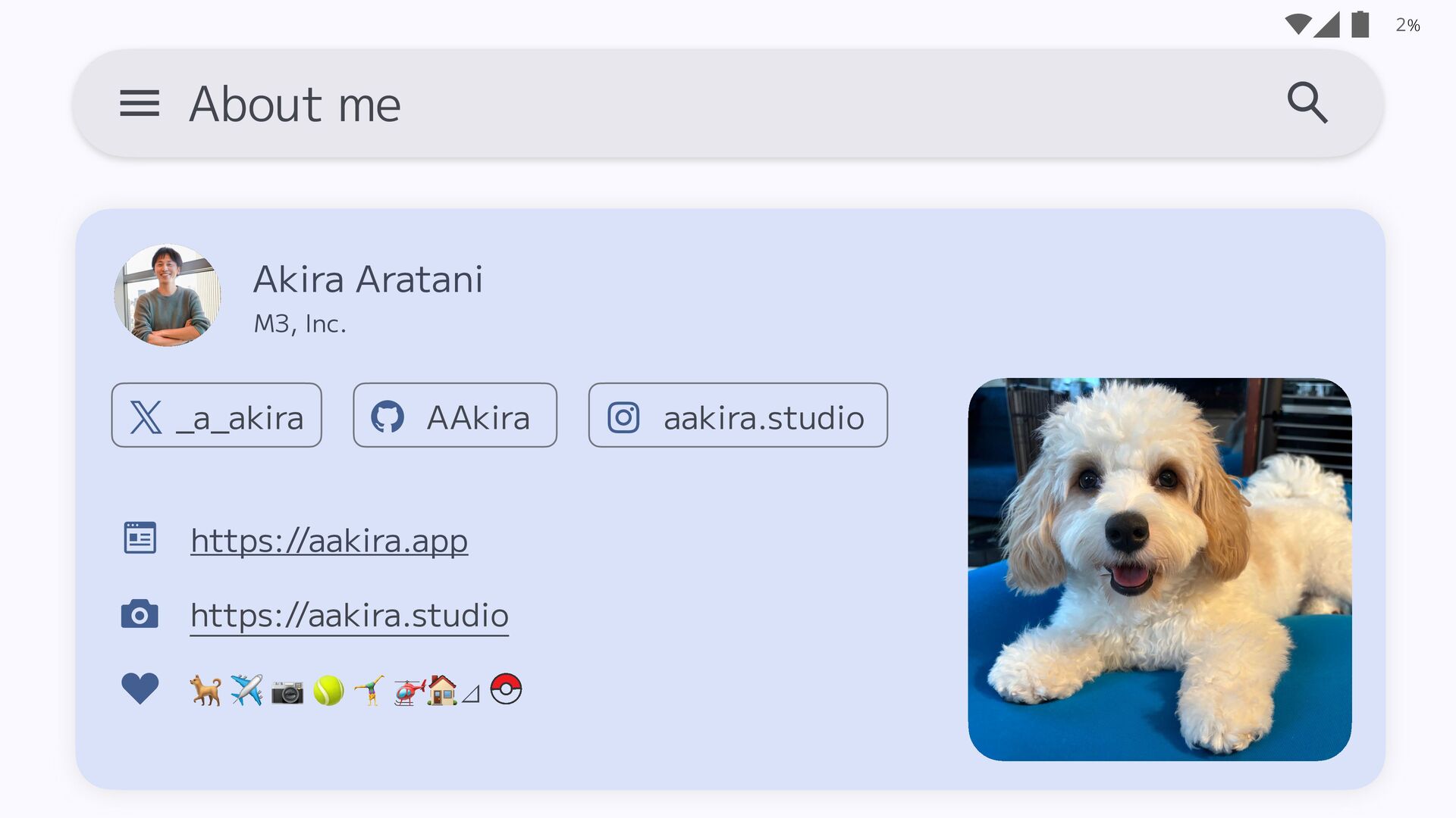 1. % About me 2 https://aakira.app https://aakira.studio 🐕 ✈ 📷 🎾
