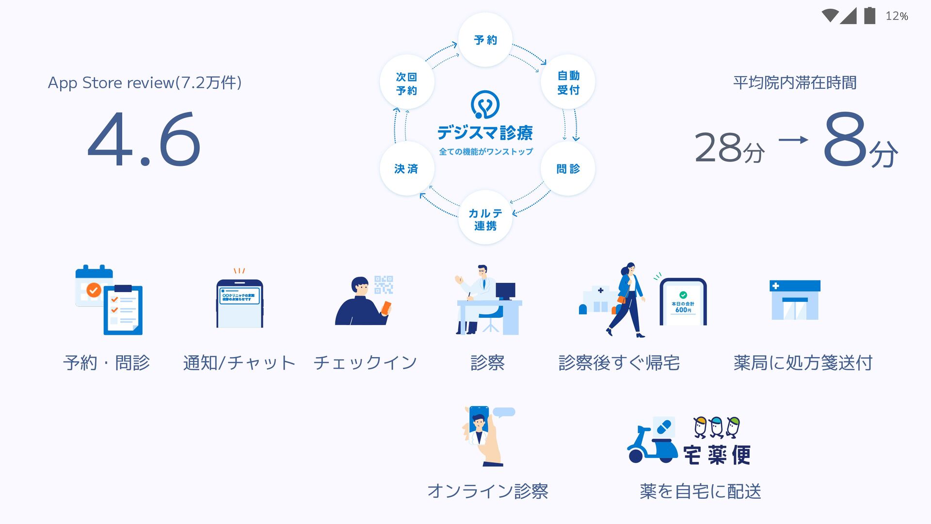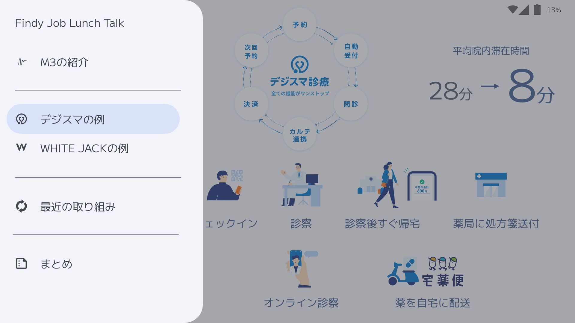 4.6 App Store review(7.2万件) 8分 平均院内滞在時間 28分 まとめ 最近の取り組み WHITE JACKの例 デジスマの例 M3の紹介 Findy Job Lunch Talk