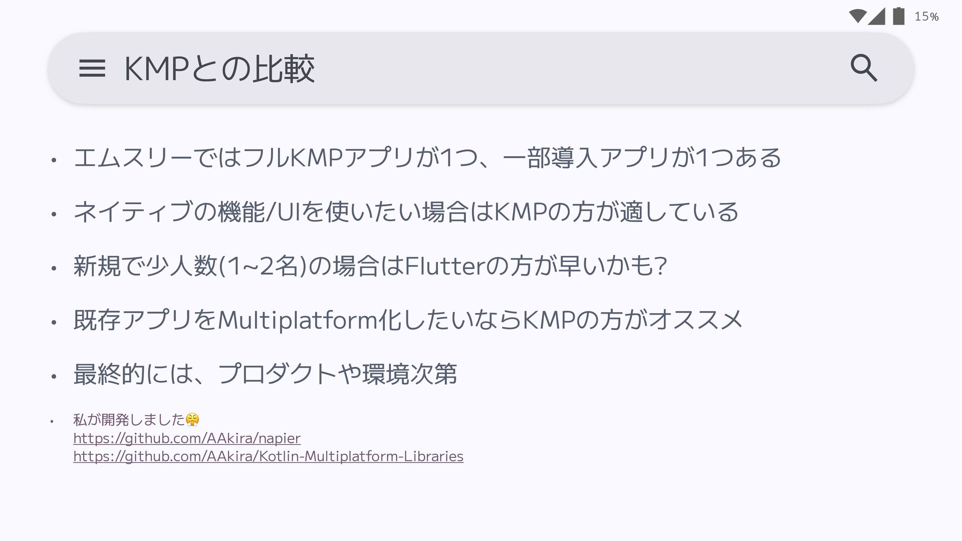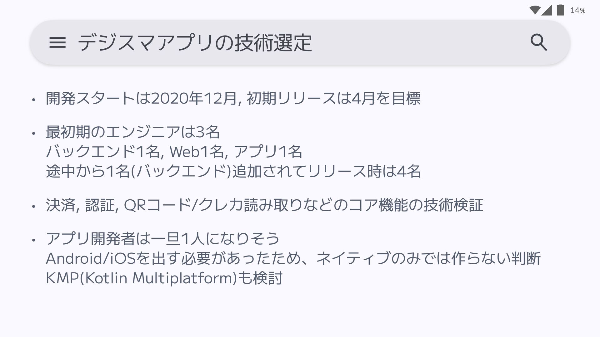 • 決済, 認証, QRコード/クレカ読み取りなどのコア機能の技術検証 • アプリ開発者は一旦1人になりそう Android/iOSを出す必要があったため、ネイティブのみでは作らない判断 KMP(Kotlin Multiplatform)も検討 14 デジスマアプリの技術選定