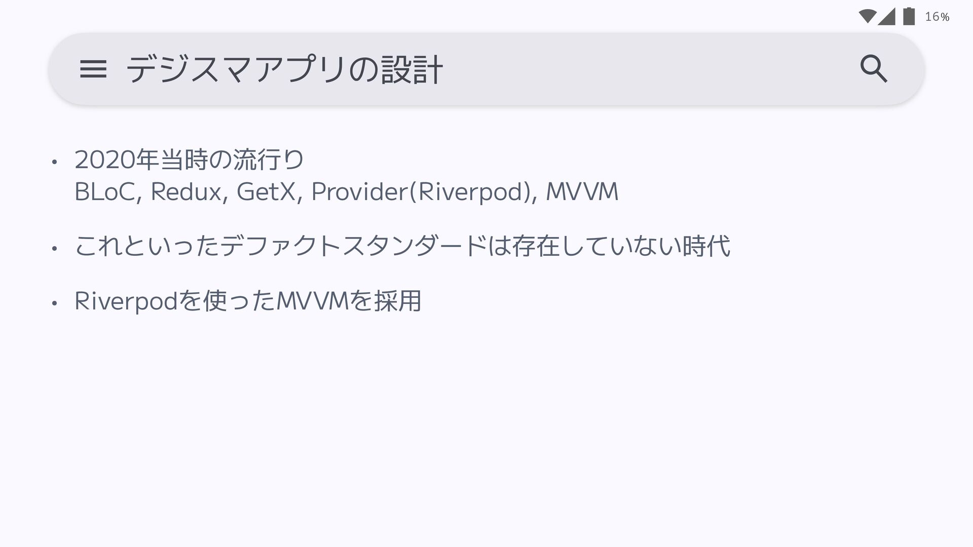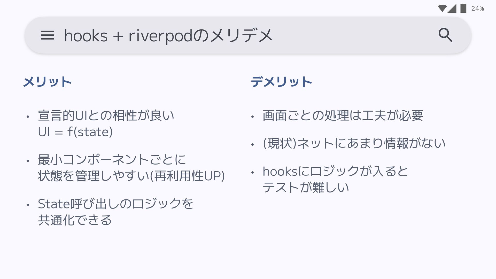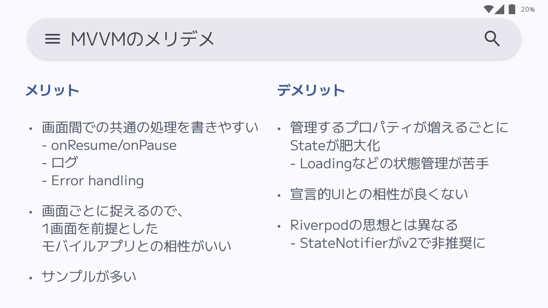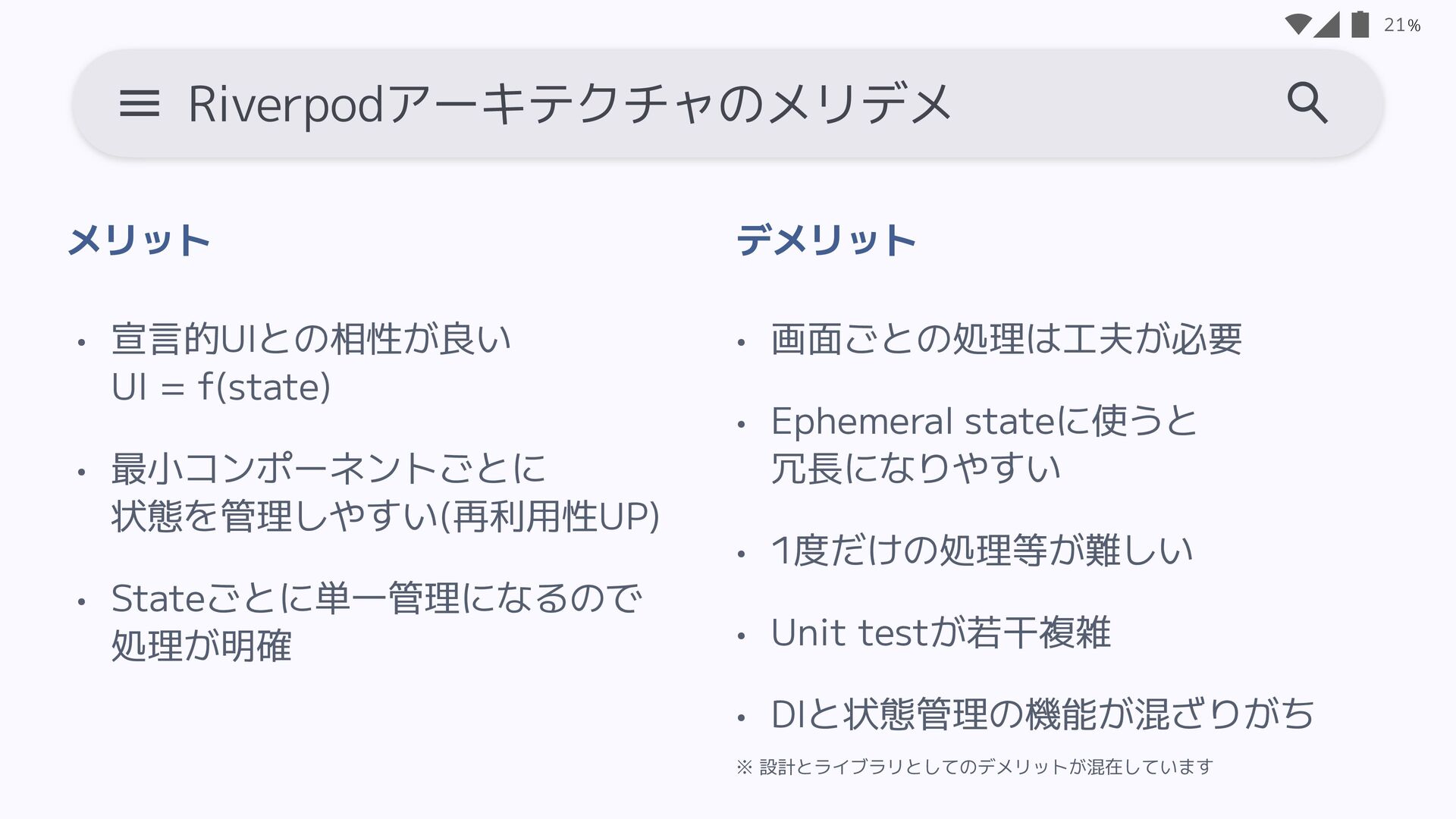 • 画面ごとに捉えるので、 1画面を前提とした モバイルアプリとの相性がいい • サンプルが多い 20 MVVMのメリデメ • 管理するプロパティが増えるごとに Stateが肥大化 - Loadingなどの状態管理が苦手 • 宣言的UIとの相性が良くない • Riverpodの思想とは異なる - StateNoti fi erがv2で非推奨に メリット デ メリット