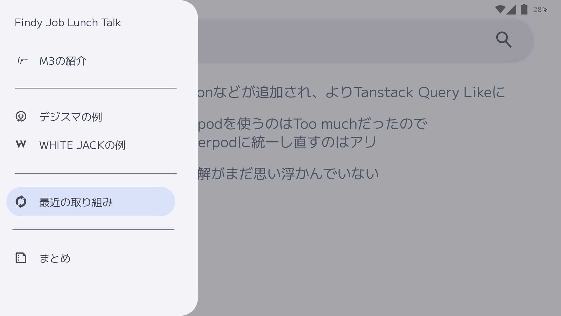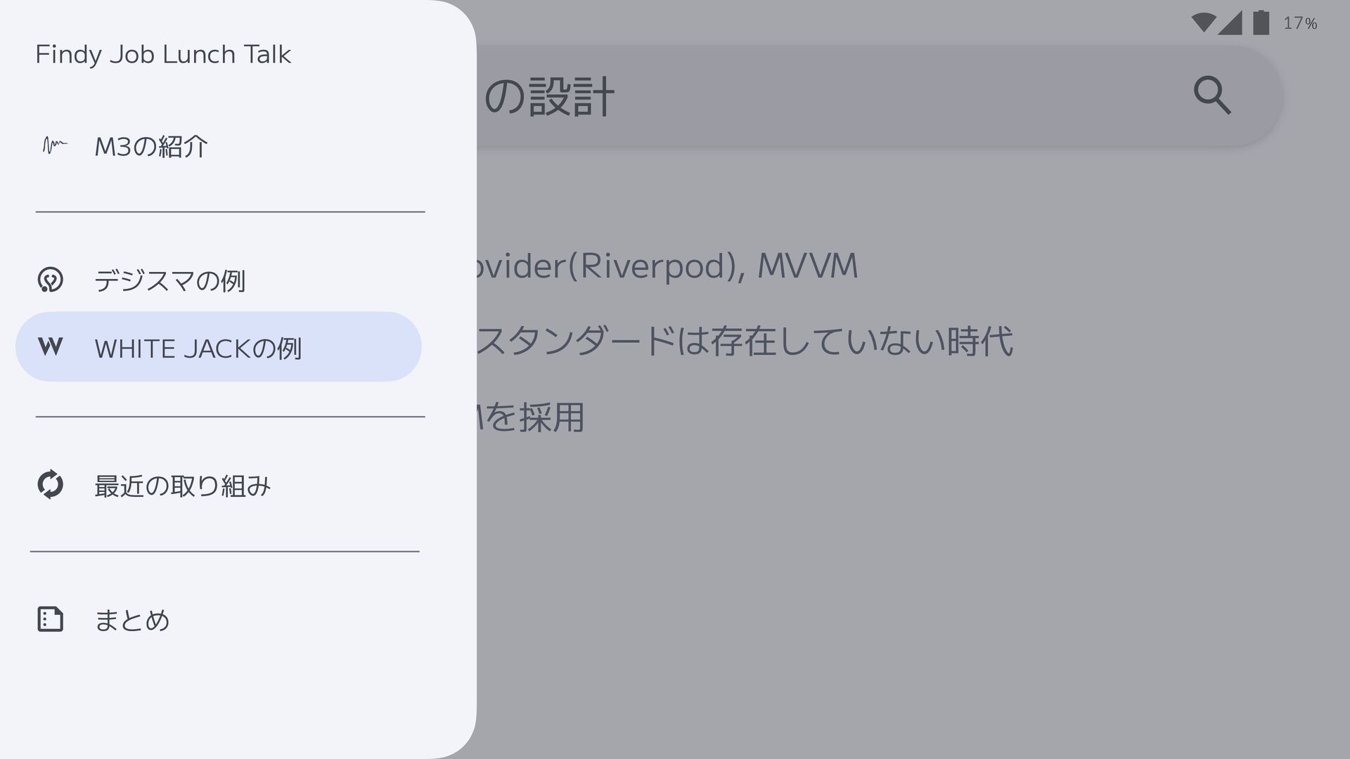 • Riverpodを使ったMVVMを採用 17 デジスマアプリの設計 まとめ 最近の取り組み WHITE JACKの例 デジスマの例 M3の紹介 Findy Job Lunch Talk