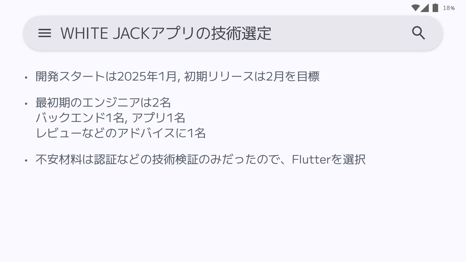 ューなどのアドバイスに1名 • 不安材料は認証などの技術検証のみだったので、Flutterを選択 18 WHITE JACKアプリの技術選定