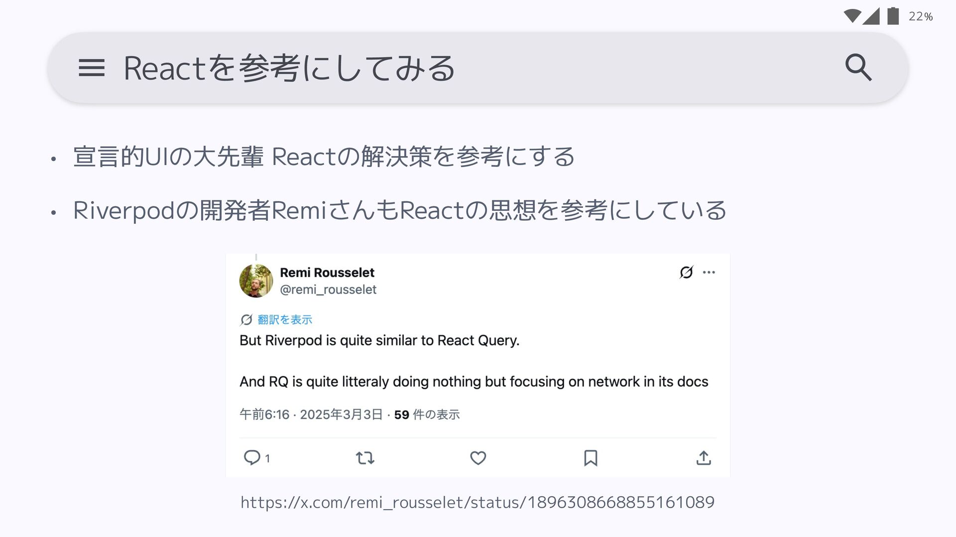 状態を管理しやすい(再利用性UP) • Stateごとに単一管理になるので 処理が明確 21 Riverpodアーキテクチャのメリデメ • 画面ごとの処理は工夫が必要 • Ephemeral stateに使うと 冗長になりやすい • 1度だけの処理等が難しい • Unit testが若干複雑 • DIと状態管理の機能が混 ざ りがち メリット デ メリット ※ 設計とライブラリとしてのデメリットが混在しています