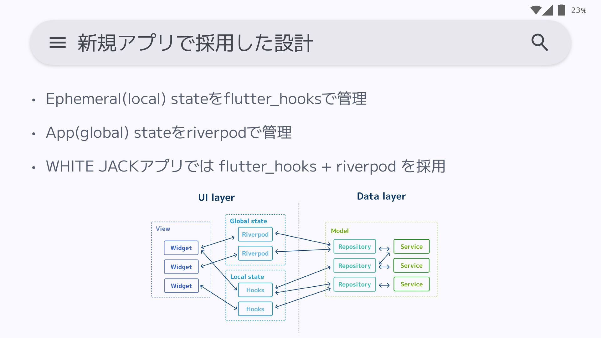 WHITE JACKアプリでは fl utter_hooks + riverpod を採用 23 新規アプリで採用した設計