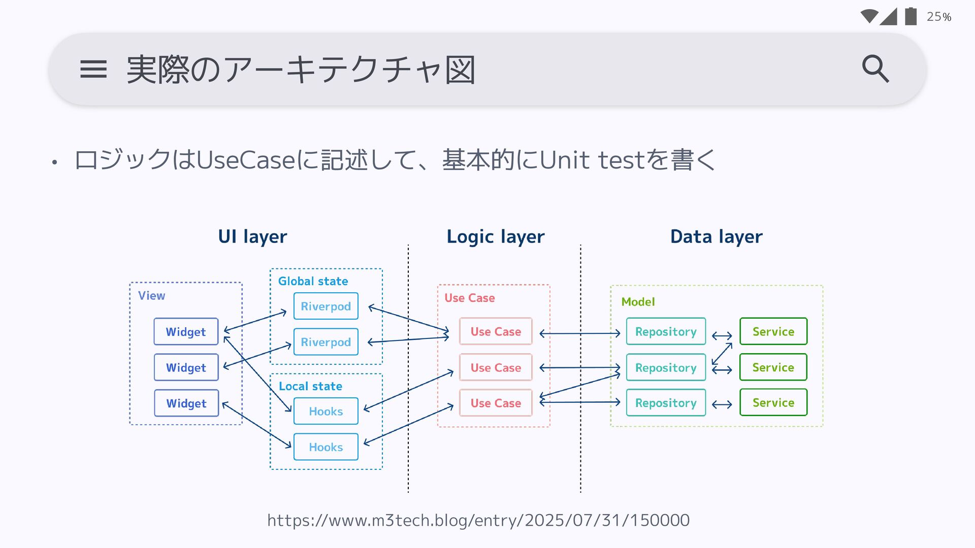 状態を管理しやすい(再利用性UP) • State呼び出しのロジックを 共通化できる 24 hooks + riverpodのメリデメ • 画面ごとの処理は工夫が必要 • (現状)ネットにあまり情報がない • hooksにロジックが入ると テストが難しい メリット デ メリット