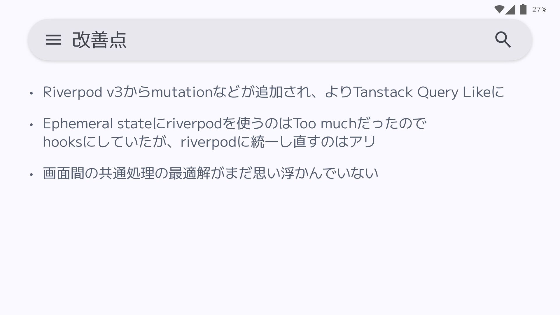 hooksにしていたが、riverpodに統一し直すのはアリ • 画面間の共通処理の最適解がまだ思い浮かんでいない 27 改善点