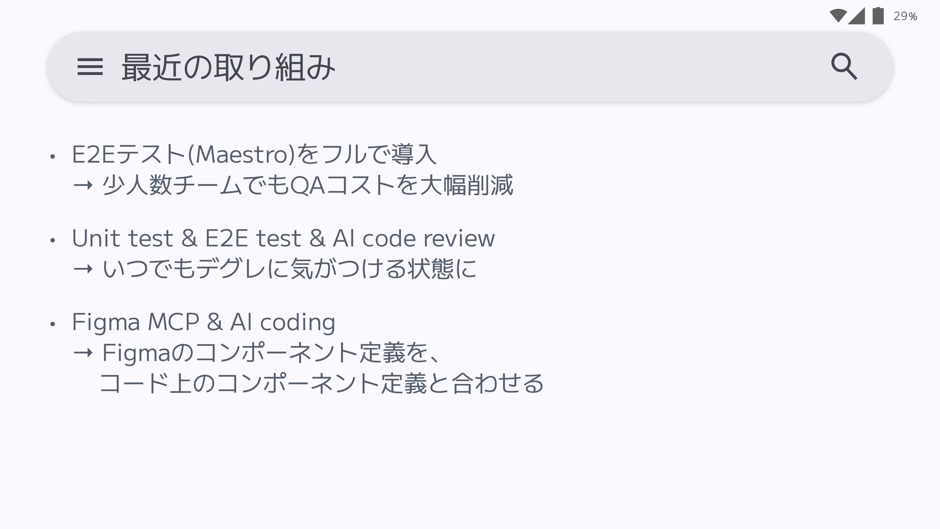 17. % • E2Eテスト(Maestro)をフルで導入 → 少人数チームでもQAコストを大幅削減 • Unit test & E2E