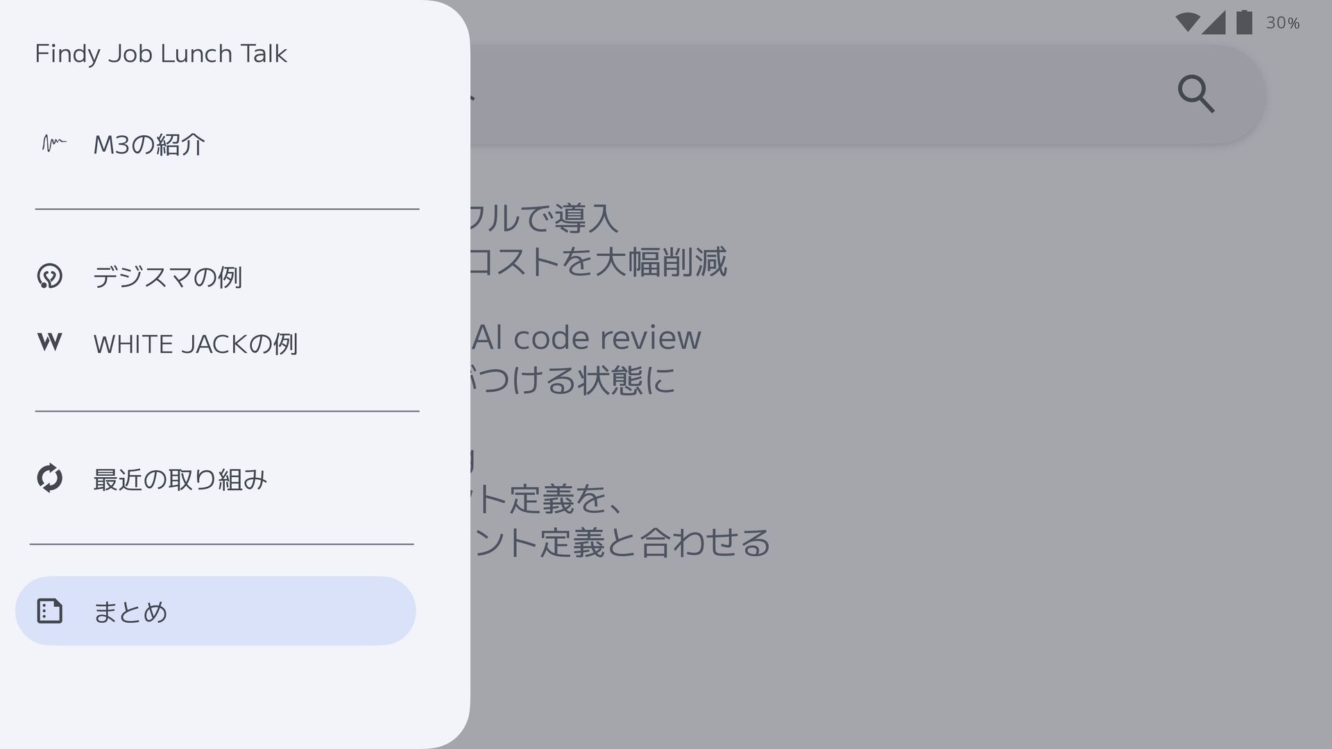 test & AI code review → いつでもデグレに気がつける状態に • Figma MCP & AI coding → Figmaのコン ポ ーネント定義を、 コード上のコン ポ ーネント定義と合わせる 30 最近の取り組み まとめ 最近の取り組み WHITE JACKの例 デジスマの例 M3の紹介 Findy Job Lunch Talk