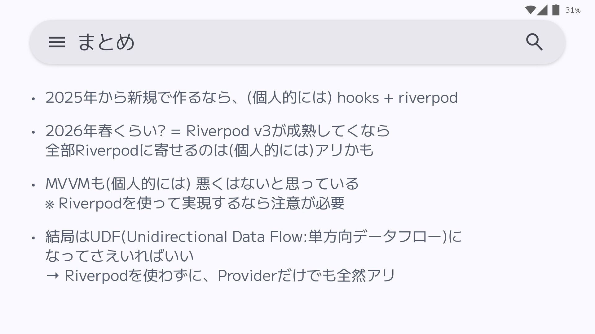v3が成熟してくなら 全部Riverpodに寄せるのは(個人的には)アリかも • MVVMも(個人的には) 悪くはないと思っている ※ Riverpodを使って実現するなら注意が必要 • 結局はUDF(Unidirectional Data Flow:単方向データフロー)に なってさえいればいい → Riverpodを使わずに、Providerだけでも全然アリ 32 まとめ 設計は宗教 設計はプロダクトの状況、環境によって 最適解が変わるもの。 MVVMだから絶対ダメなどはない。 理解した