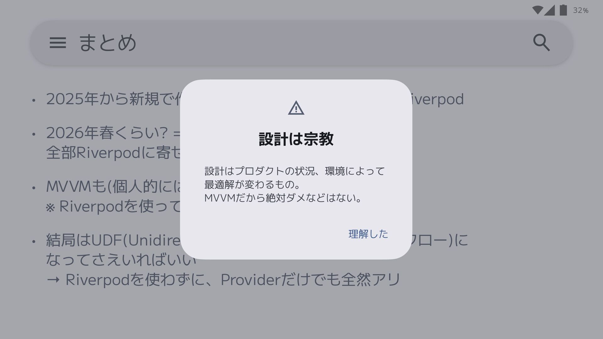 v3が成熟してくなら 全部Riverpodに寄せるのは(個人的には)アリかも • MVVMも(個人的には) 悪くはないと思っている ※ Riverpodを使って実現するなら注意が必要 • 結局はUDF(Unidirectional Data Flow:単方向データフロー)に なってさえいればいい → Riverpodを使わずに、Providerだけでも全然アリ 31 まとめ
