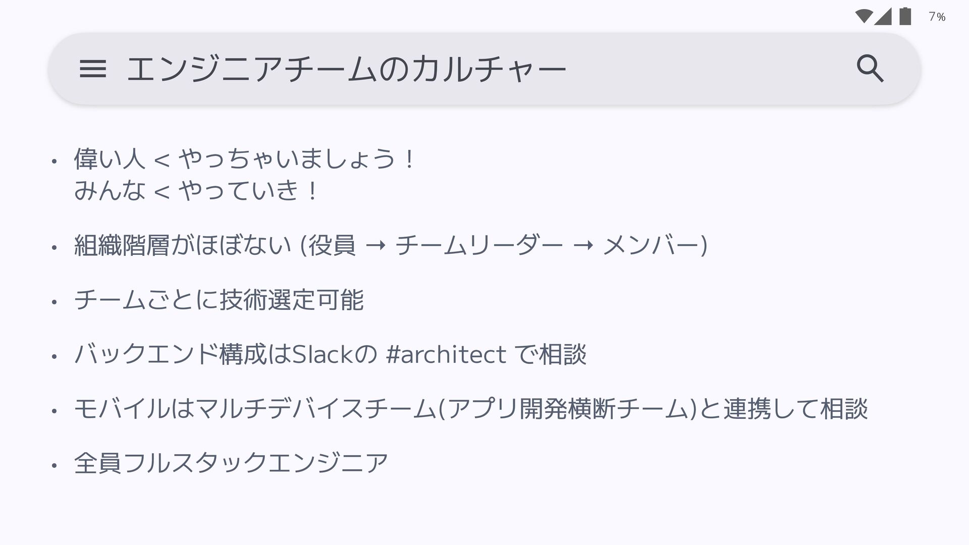(役員 → チームリーダー → メンバー) • チームごとに技術選定可能 • バックエンド構成はSlackの #architect で相談 • モバイルはマルチデバイスチーム(アプリ開発横断チーム)と連携して相談 • 全員フルスタックエンジニア 7 エンジニアチームのカルチャー