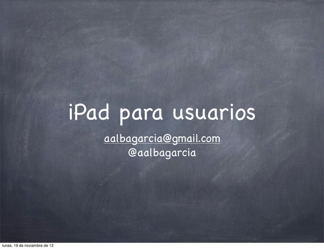 el iPad Volver a pulsar para desbloquear (también se puede usar botón de inicio) Mantener pulsado para desactivar el iPad Mantener pulsado hasta que salga el icono de Apple para reactivar lunes, 19 de noviembre de 12