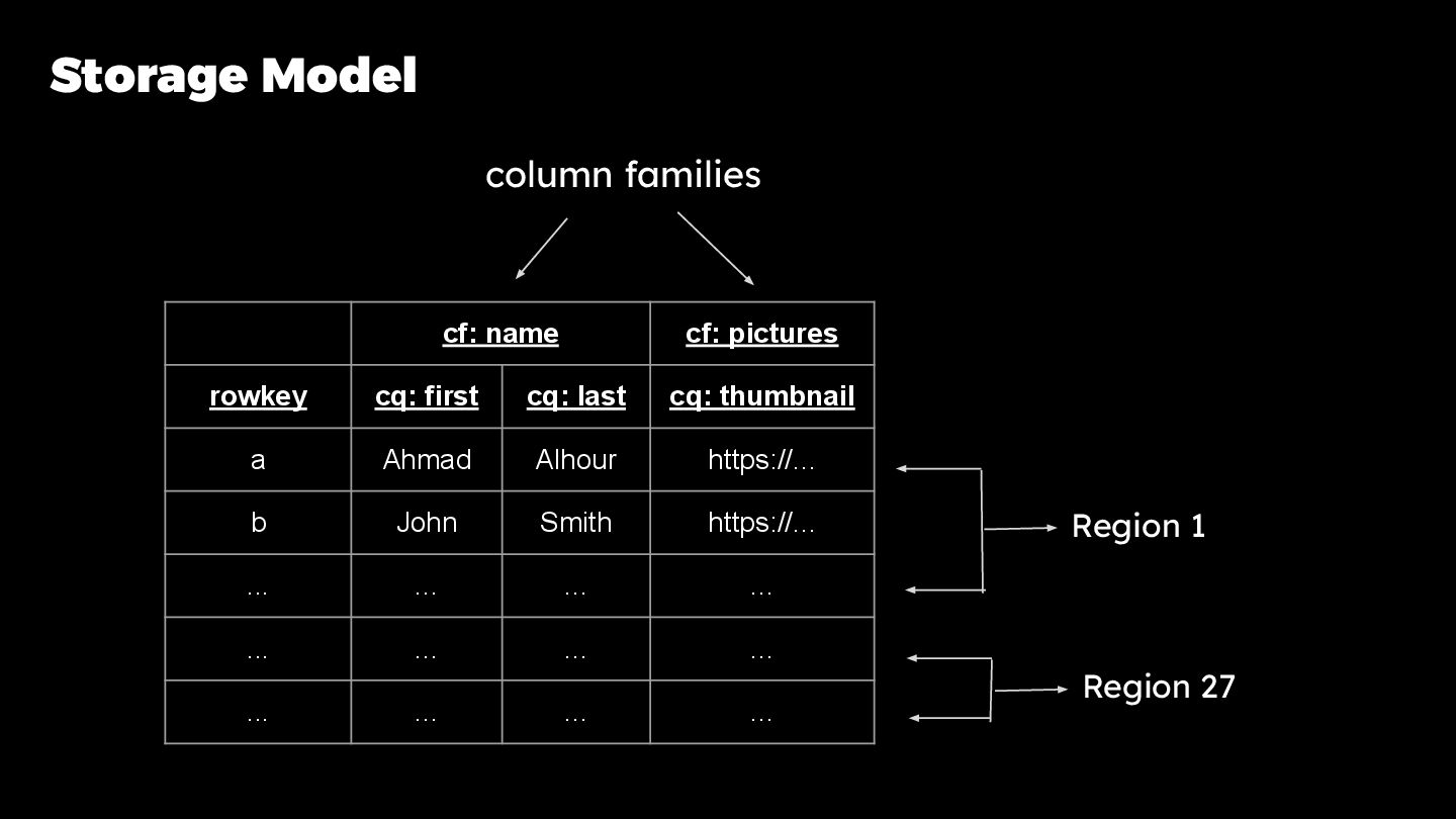 last cq: thumbnail a Ahmad Alhour https://... b John Smith https://... ... ... ... ... ... ... ... ... ... ... ... ... column families Region 1 Region 27