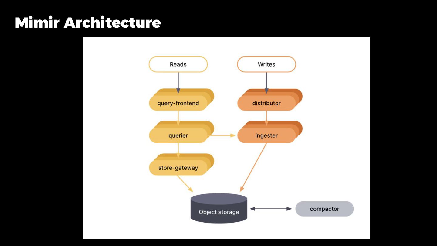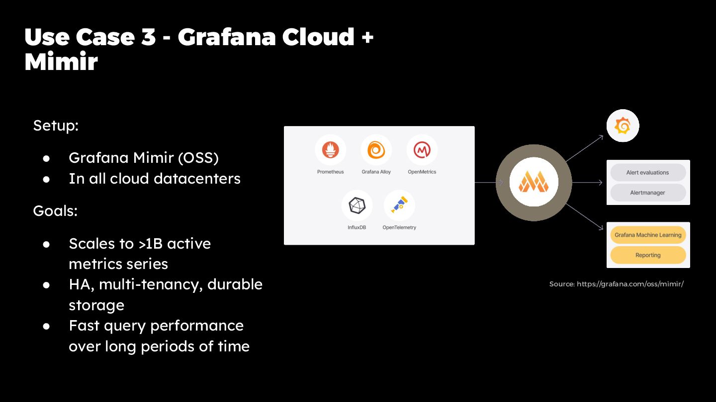 Setup: • Grafana Mimir (OSS) • In all cloud datacenters Goals: • Scales to >1B active metrics series • HA, multi-tenancy, durable storage • Fast query performance over long periods of time