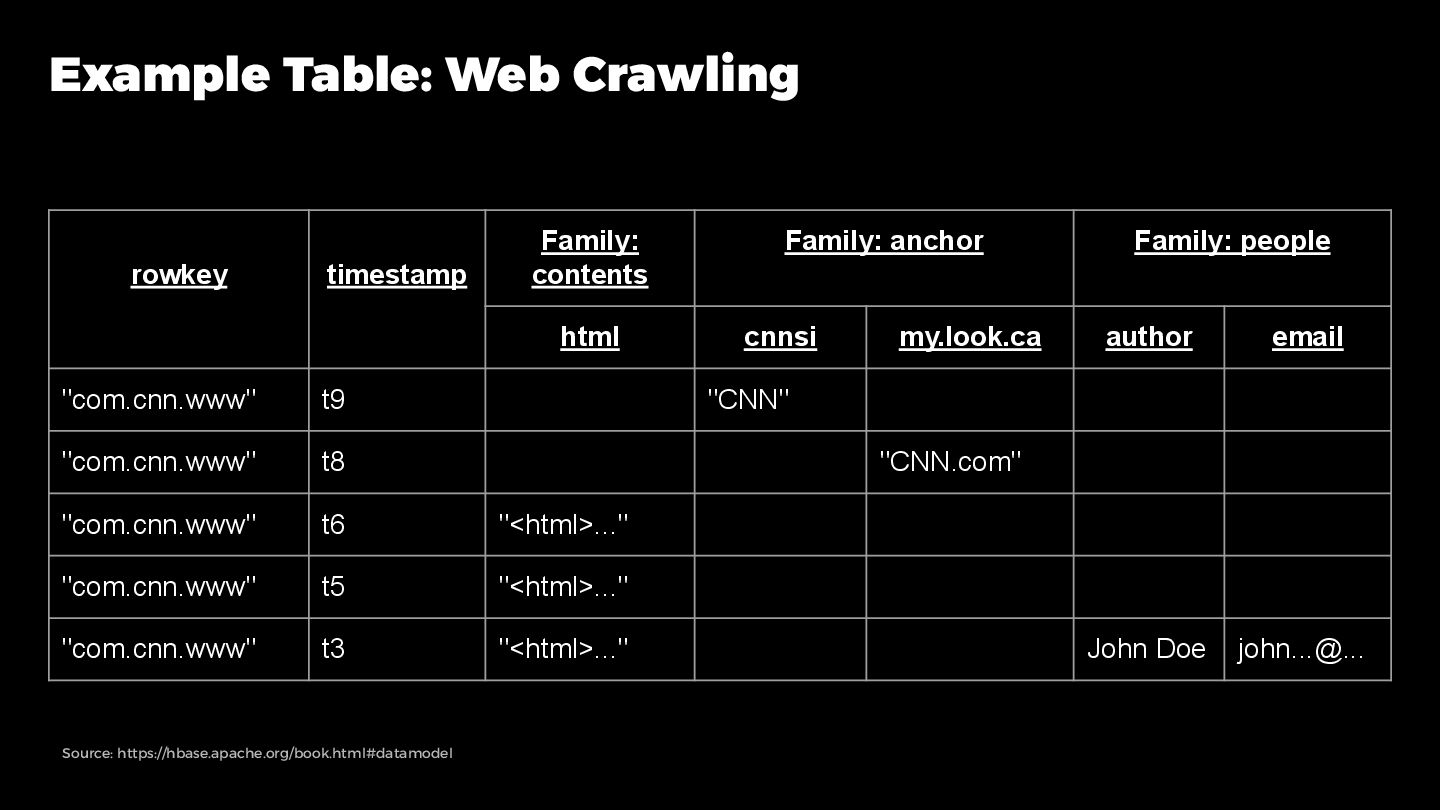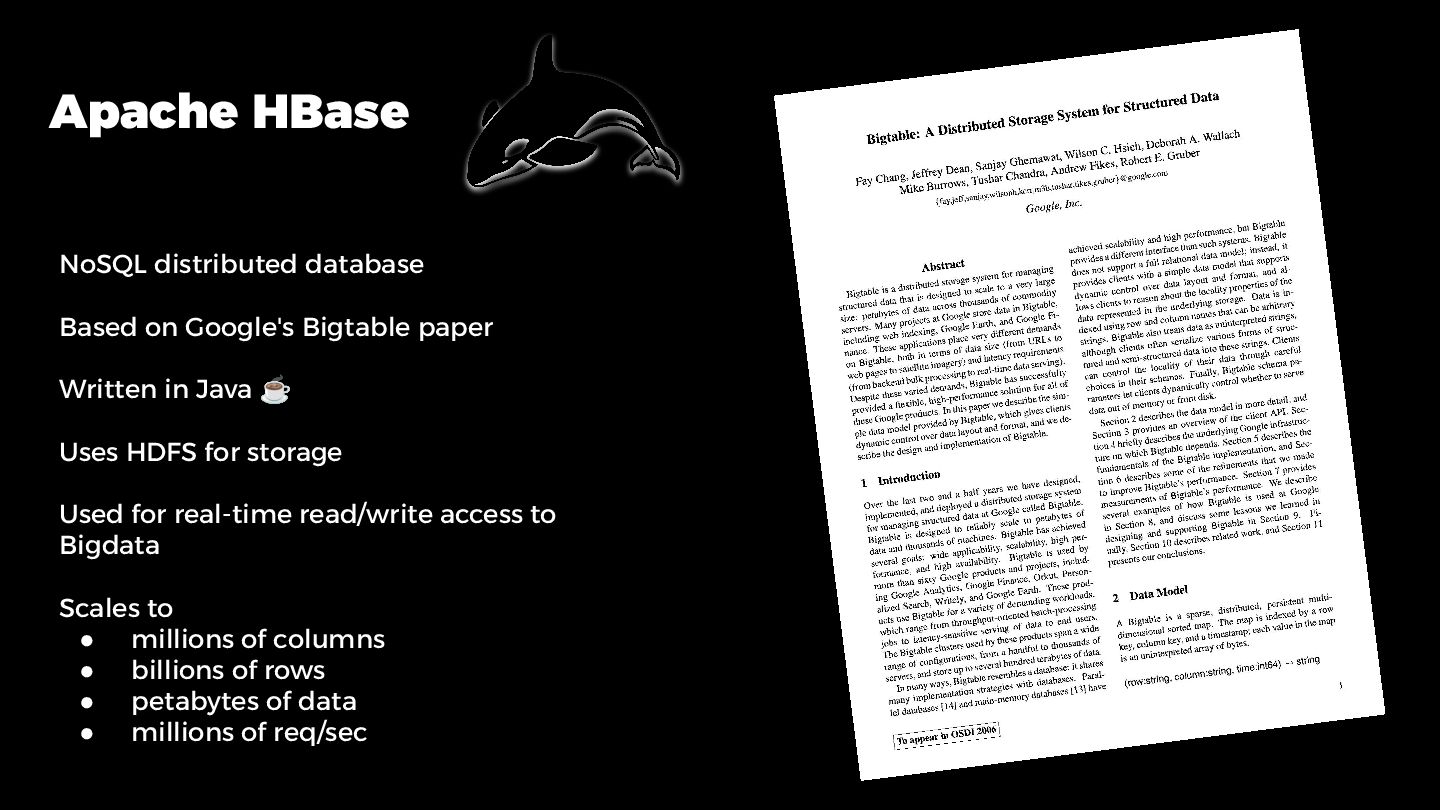 Written in Java ☕ Uses HDFS for storage Used for real-time read/write access to Bigdata Scales to • millions of columns • billions of rows • petabytes of data • millions of req/sec