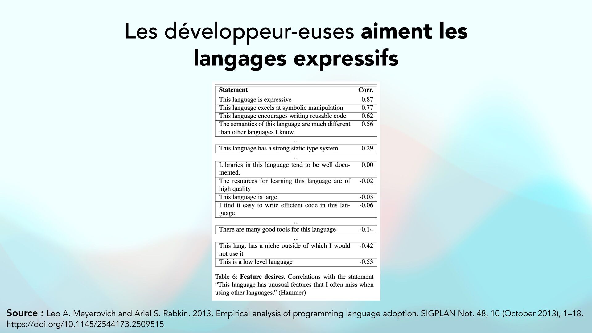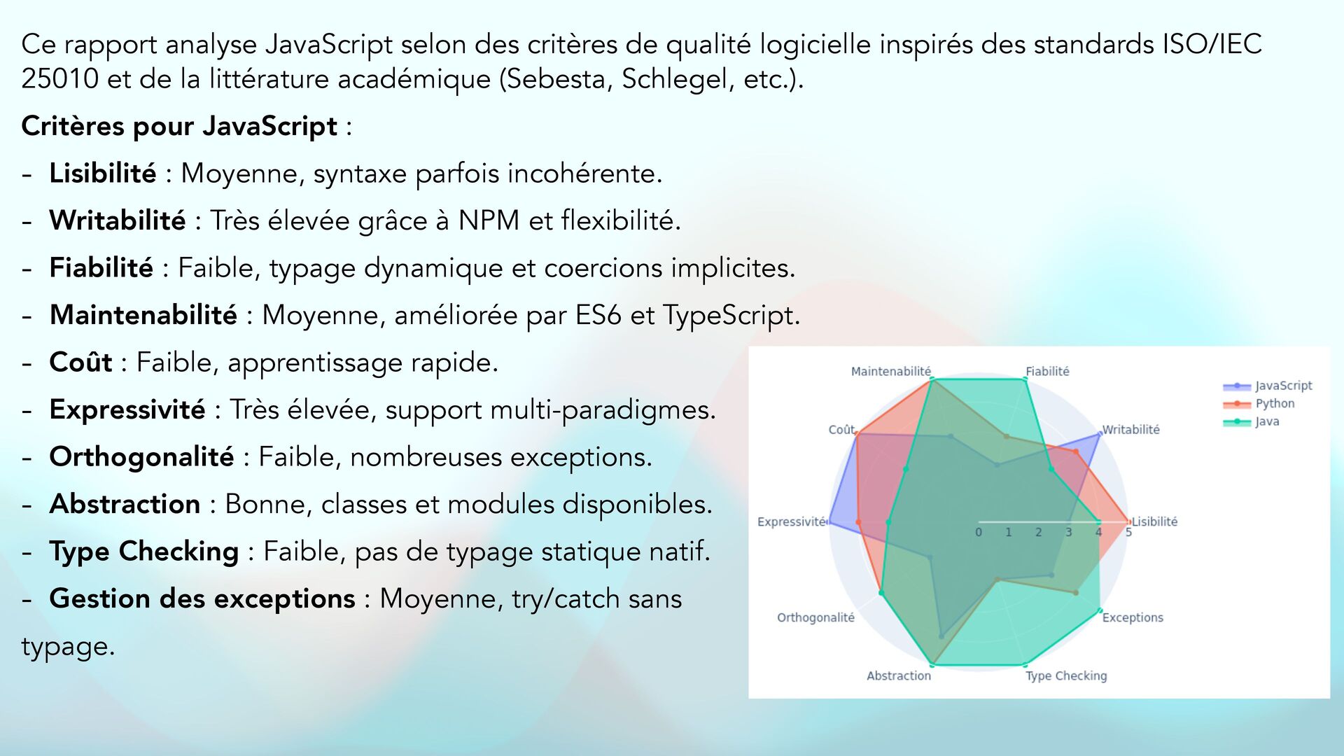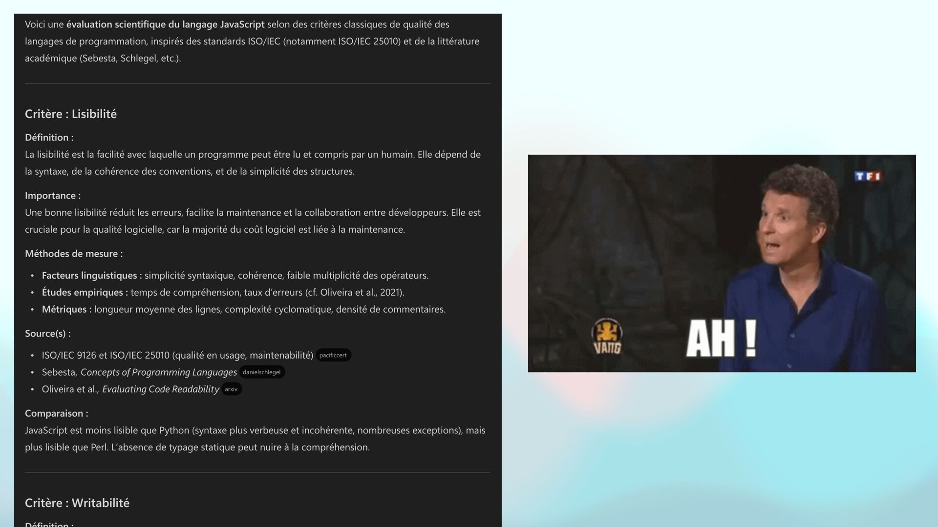 tu quali fi es e ff i cacement un langage de programmation, d'un point de vue qualité en dé fi nissant des caractéristiques identi fi ables, en me donnant pour chaque caractéristique des sources scienti fi ques fi ables et véri fi ées ? Évalue le langage de programmation [Nom du langage] selon des critères scienti fi ques de qualité. Pour chaque critère : 1. Dé fi nis clairement la caractéristique (ex. lisibilité, fi abilité, maintenabilité, etc.). 2. Explique pourquoi elle est importante pour la qualité logicielle. 3. Indique comment elle peut être mesurée ou observée (ex. métriques, propriétés du langage). 4. Fournis au moins une source académique ou standard ISO qui justi fi e ou décrit ce critère. 5. Compare avec d’autres langages si pertinent. Les critères doivent inclure au minimum : Lisibilité, Writabilité, Fiabilité, Maintenabilité, Coût, Expressivité, Orthogonalité, Support pour l’abstraction, Type checking, Gestion des exceptions. Format attendu : • Critère : [Nom] ◦ Dé fi nition : ◦ Importance : ◦ Méthodes de mesure : ◦ Source(s) : Ajoute une synthèse fi nale avec une évaluation globale et références complètes.