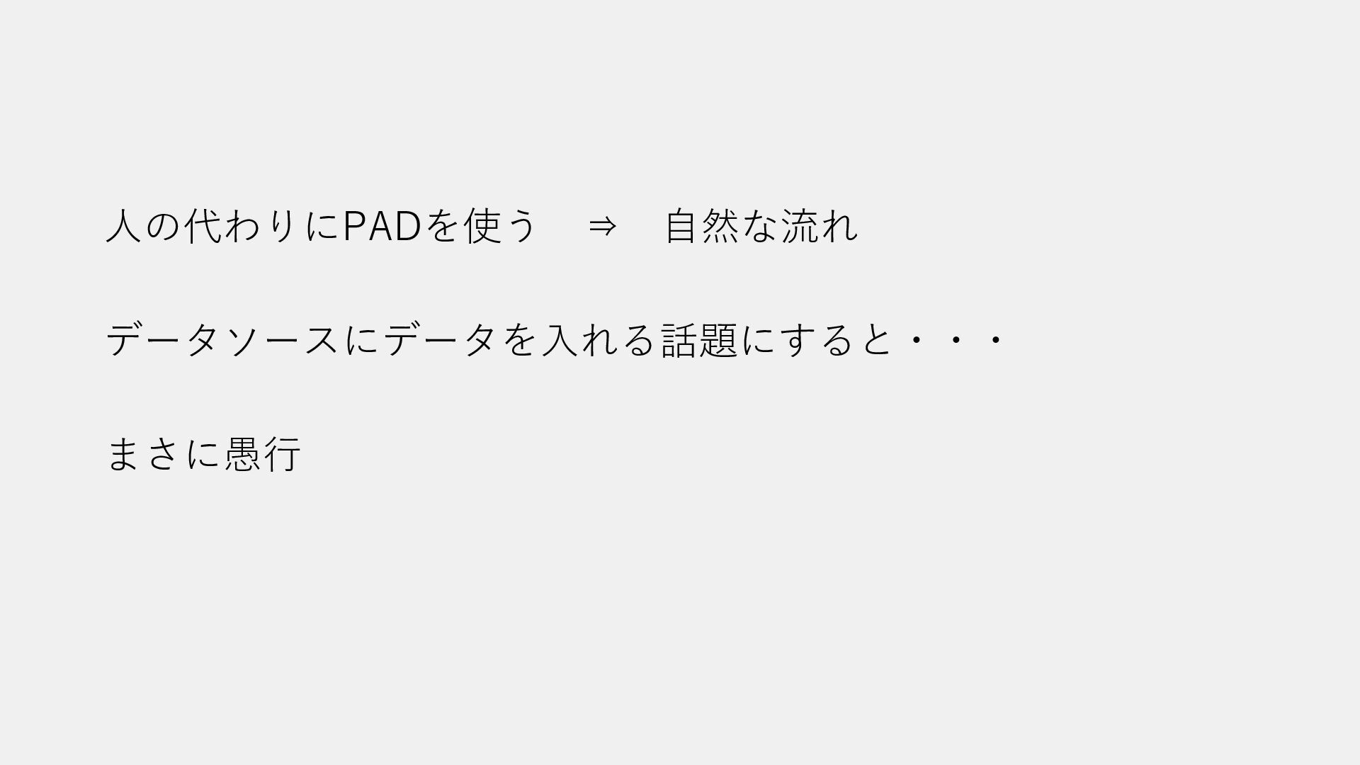 人の代わりにPADを使う ⇒ 自然な流れ データソースにデータを入れる話題にすると・・・ まさに愚行