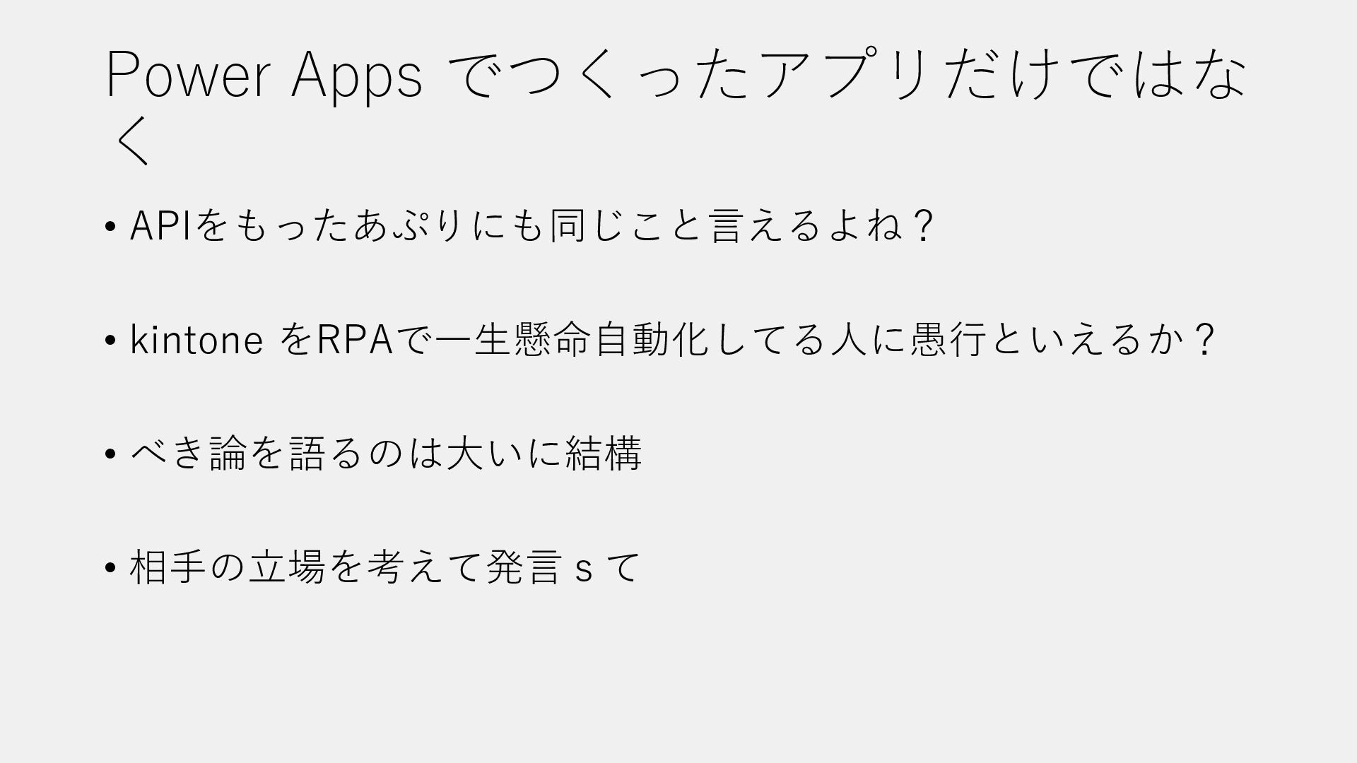 Power Apps でつくったアプリだけではな く • APIをもったあぷりにも同じこと言えるよね? • kintone をRPAで一生懸命自動化してる人に愚行といえるか? •
