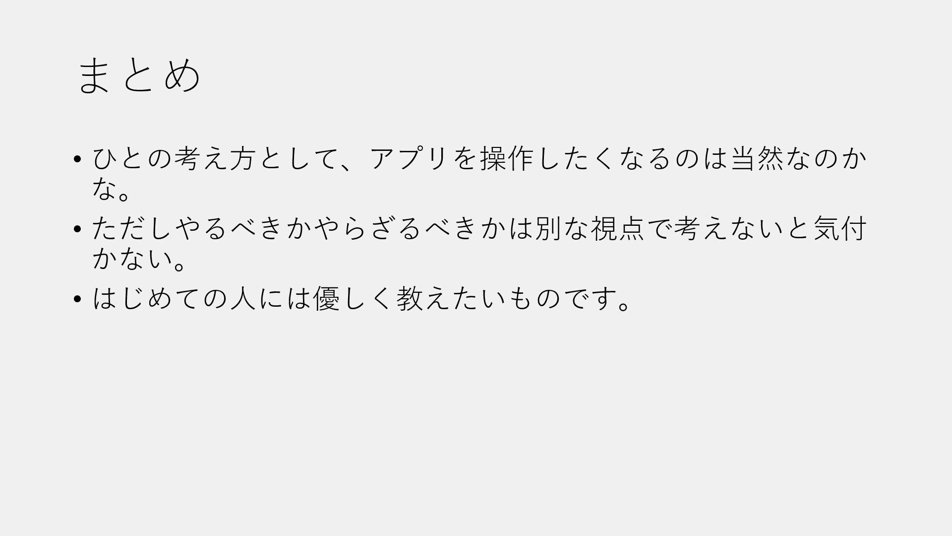 まとめ • ひとの考え方として、アプリを操作したくなるのは当然なのか な。 • ただしやるべきかやらざるべきかは別な視点で考えないと気付 かない。 • はじめての人には優しく教えたいものです。