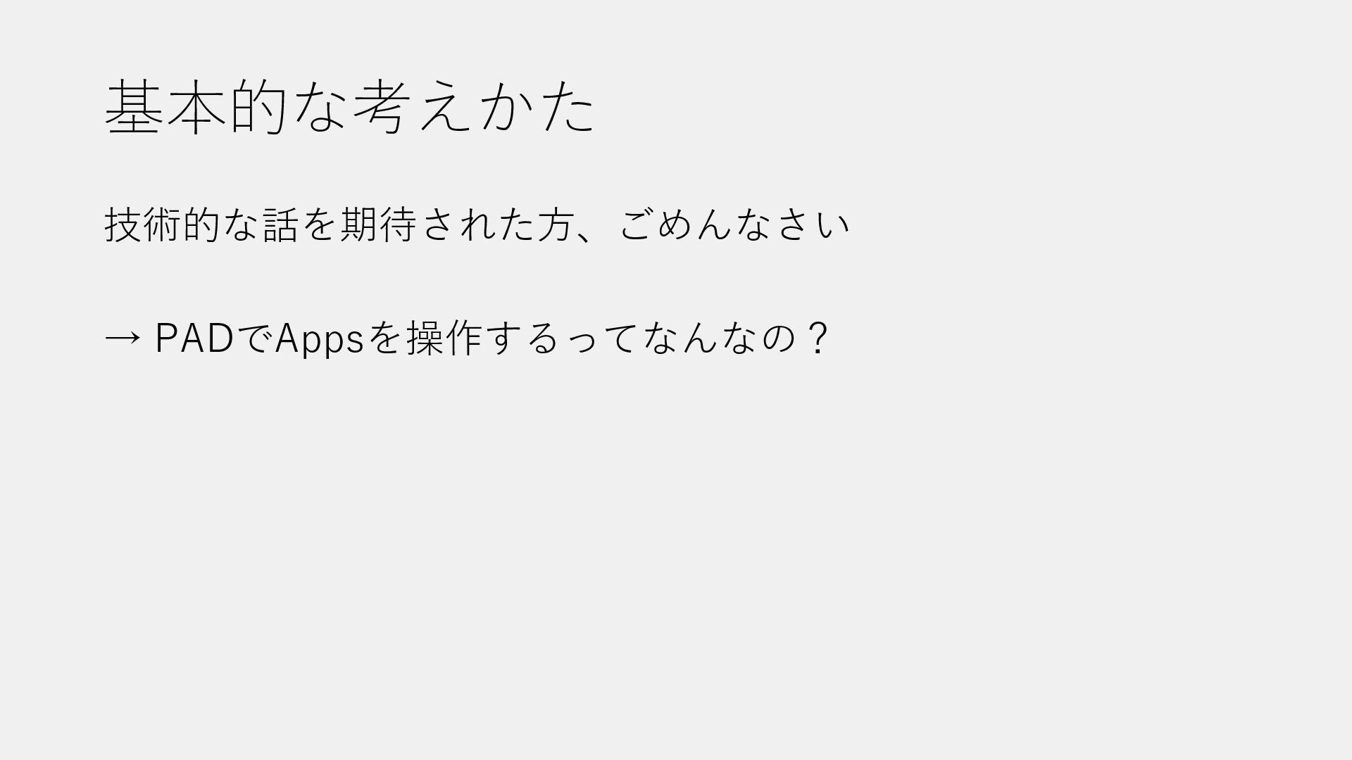 基本的な考えかた 技術的な話を期待された方、ごめんなさい → PADでAppsを操作するってなんなの?