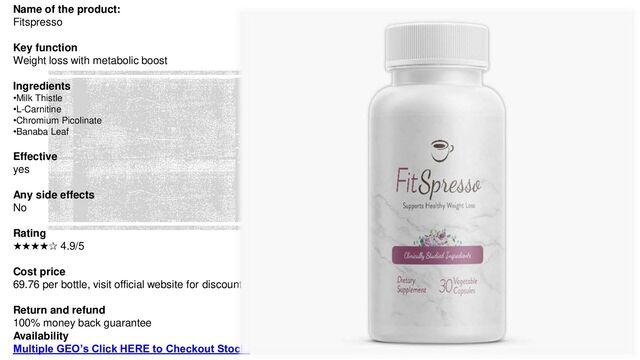 FitSpresso is an effective weight loss support formula that uses natural ingredients to help achieve your body's goals. It is a powerful product that inherently supports healthy weight loss. The FitSpresso ingredients work synergistically to support metabolism and healthy fat-burning to maintain long-lasting results.