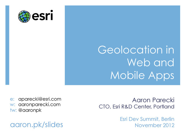 the operating system ¡ iOS delivers location events to a delegate object in the app when it’s running ¡ iOS may terminate your app due to high memory conditions, etc. ¡ If terminated, iOS will re-launch the app in the background when a location event is received ¡ Less control over when the data is received, but less code to manage aaron.pk/slides