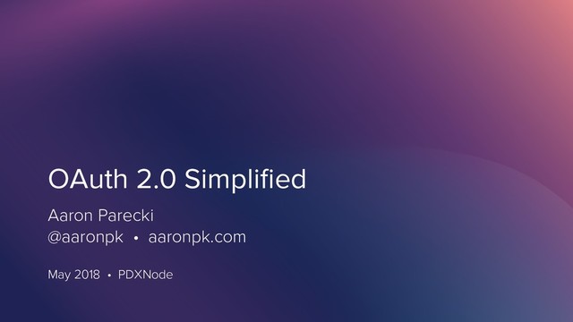 OAuth 2.0 Simplified: OAuth 2.0 has become the industry standard in providing secure access to web APIs. OAuth allows users to grant external applications access to their data, such as profile data, photos, and email, without compromising account security. However, OAuth can be intimidating when first starting out. In this talk, you'll learn about the various OAuth workflows, and get a simplified overview of the framework, highlighting a few typical use cases.