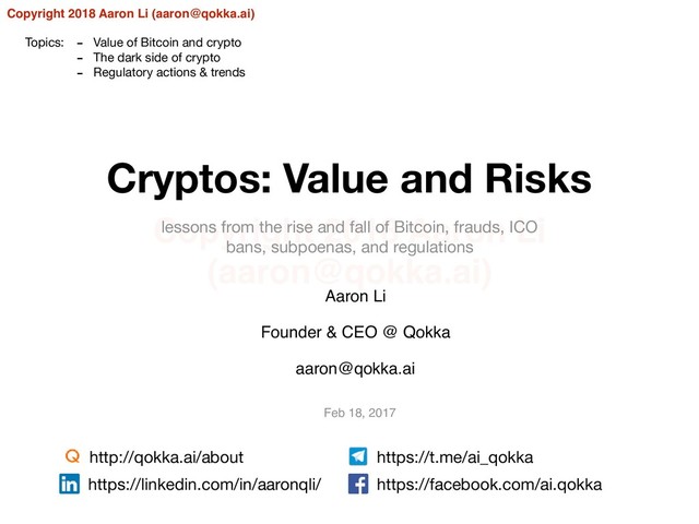 Cryptos: Value and Risks lessons from the rise and fall of Bitcoin, frauds, ICO bans, subpoenas, and regulations Founder & CEO @ Qokka - Value of Bitcoin and crypto - The dark side of crypto - Regulatory actions & trends Feb 18, 2017 https://linkedin.com/in/aaronqli/ https://t.me/ai_qokka https://facebook.com/ai.qokka http://qokka.ai/about Aaron Li [email protected] Topics: