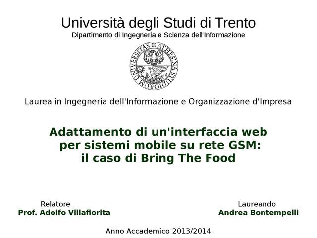 dell'Informazione Laurea in Ingegneria dell'Informazione e Organizzazione d'Impresa Adattamento di un'interfaccia web per sistemi mobile su rete GSM: il caso di Bring The Food Relatore Laureando Prof. Adolfo Villafiorita Andrea Bontempelli Anno Accademico 2013/2014