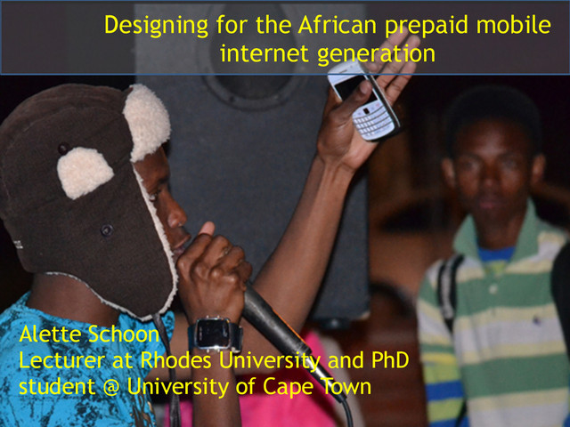 text, photo, linkless • Network dependent – Edge, 2G • Feature phone – Java, Symbian, Blackberry, Android • Outside ‘the cloud’ of content creation – offline sharing i.e. Bluetooth • See Donner, Jonathan, Gitau, Shikoh, & Gary Marsden (2011). Exploring mobile-only internet use: results of a training study in urban South Africa. International Journal of Communication, 5, 574–597. (PDF)