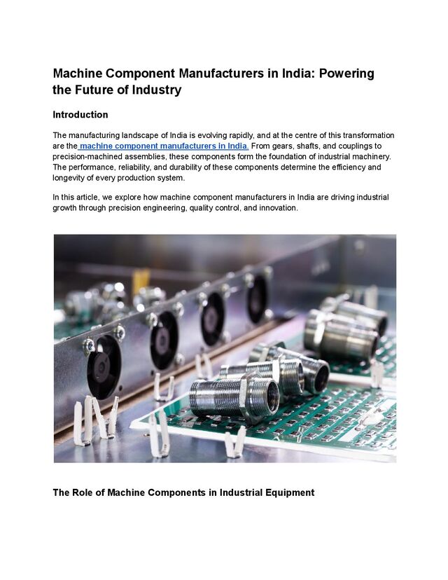 Introduction The manufacturing landscape of India is evolving rapidly, and at the centre of this transformation are the machine component manufacturers in India. From gears, shafts, and couplings to precision-machined assemblies, these components form the foundation of industrial machinery. The performance, reliability, and durability of these components determine the efficiency and longevity of every production system. In this article, we explore how machine component manufacturers in India are driving industrial growth through precision engineering, quality control, and innovation. The Role of Machine Components in Industrial Equipment