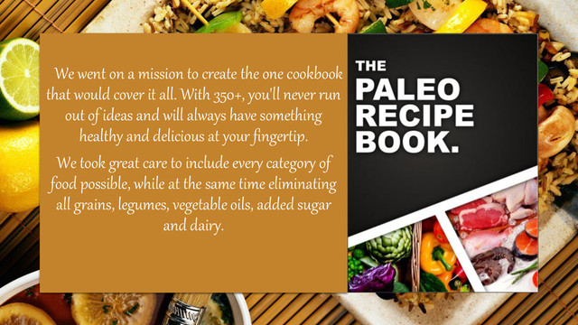 that would cover it all. With 350+, you'll never run out of ideas and will always have something healthy and delicious at your fingertip. We took great care to include every category of food possible, while at the same time eliminating all grains, legumes, vegetable oils, added sugar and dairy.
