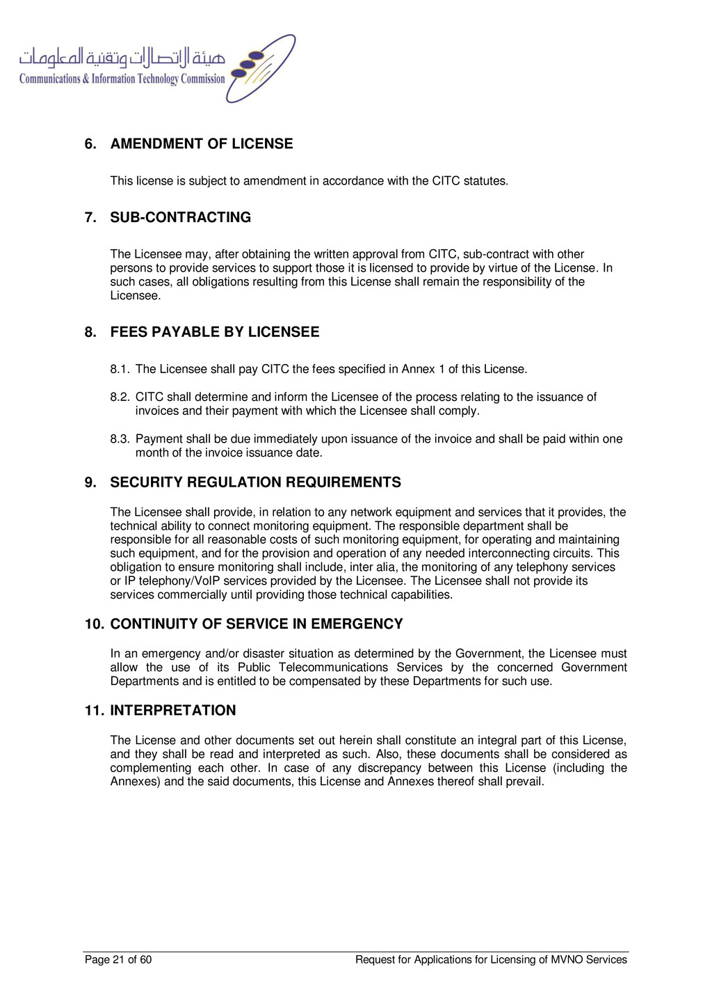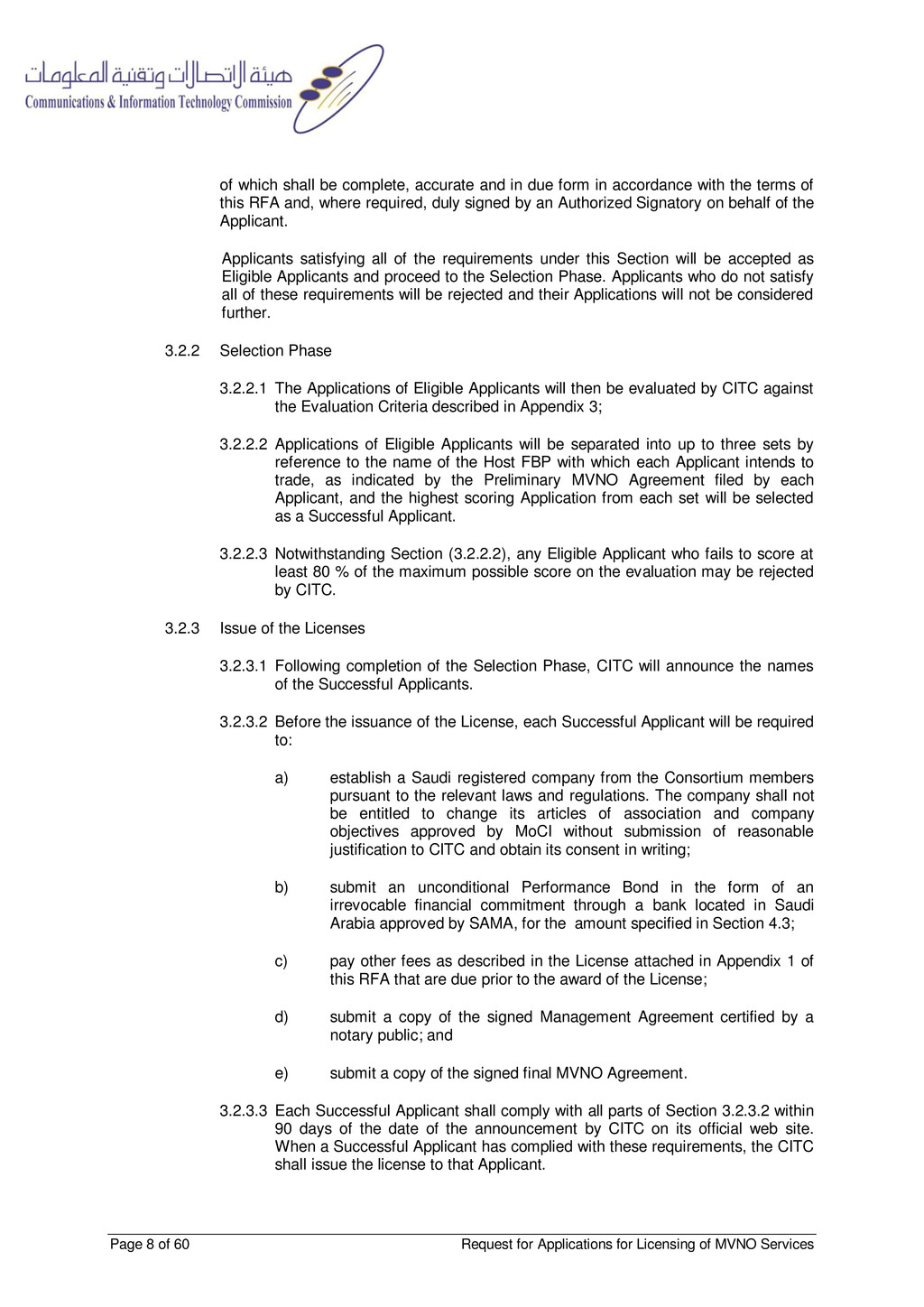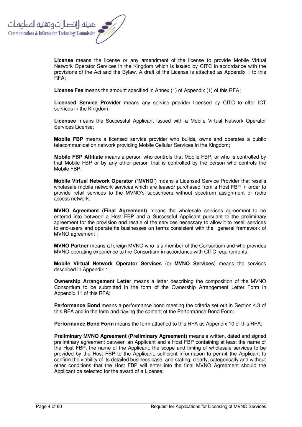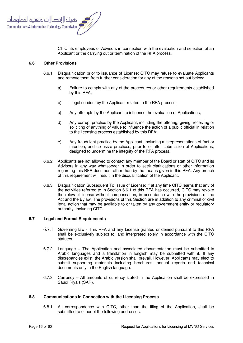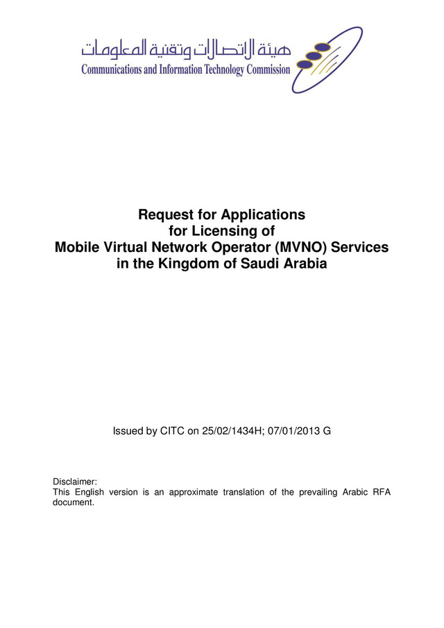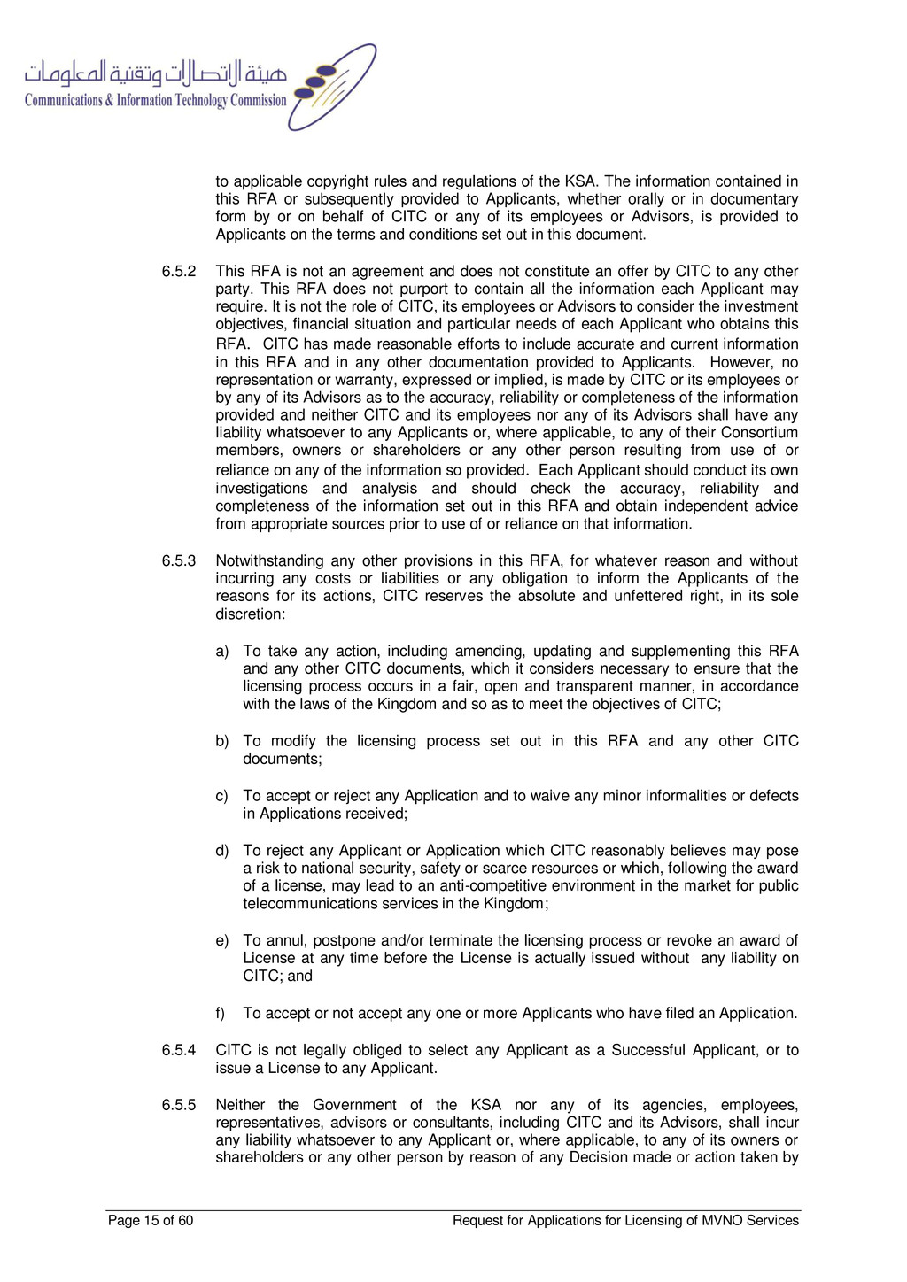 MVNO Services to applicable copyright rules and regulations of the KSA. The information contained in this RFA or subsequently provided to Applicants, whether orally or in documentary form by or on behalf of CITC or any of its employees or Advisors, is provided to Applicants on the terms and conditions set out in this document. 6.5.2 This RFA is not an agreement and does not constitute an offer by CITC to any other party. This RFA does not purport to contain all the information each Applicant may require. It is not the role of CITC, its employees or Advisors to consider the investment objectives, financial situation and particular needs of each Applicant who obtains this RFA. CITC has made reasonable efforts to include accurate and current information in this RFA and in any other documentation provided to Applicants. However, no representation or warranty, expressed or implied, is made by CITC or its employees or by any of its Advisors as to the accuracy, reliability or completeness of the information provided and neither CITC and its employees nor any of its Advisors shall have any liability whatsoever to any Applicants or, where applicable, to any of their Consortium members, owners or shareholders or any other person resulting from use of or reliance on any of the information so provided. Each Applicant should conduct its own investigations and analysis and should check the accuracy, reliability and completeness of the information set out in this RFA and obtain independent advice from appropriate sources prior to use of or reliance on that information. 6.5.3 Notwithstanding any other provisions in this RFA, for whatever reason and without incurring any costs or liabilities or any obligation to inform the Applicants of the reasons for its actions, CITC reserves the absolute and unfettered right, in its sole discretion: a) To take any action, including amending, updating and supplementing this RFA and any other CITC documents, which it considers necessary to ensure that the licensing process occurs in a fair, open and transparent manner, in accordance with the laws of the Kingdom and so as to meet the objectives of CITC; b) To modify the licensing process set out in this RFA and any other CITC documents; c) To accept or reject any Application and to waive any minor informalities or defects in Applications received; d) To reject any Applicant or Application which CITC reasonably believes may pose a risk to national security, safety or scarce resources or which, following the award of a license, may lead to an anti-competitive environment in the market for public telecommunications services in the Kingdom; e) To annul, postpone and/or terminate the licensing process or revoke an award of License at any time before the License is actually issued without any liability on CITC; and f) To accept or not accept any one or more Applicants who have filed an Application. 6.5.4 CITC is not legally obliged to select any Applicant as a Successful Applicant, or to issue a License to any Applicant. 6.5.5 Neither the Government of the KSA nor any of its agencies, employees, representatives, advisors or consultants, including CITC and its Advisors, shall incur any liability whatsoever to any Applicant or, where applicable, to any of its owners or shareholders or any other person by reason of any Decision made or action taken by