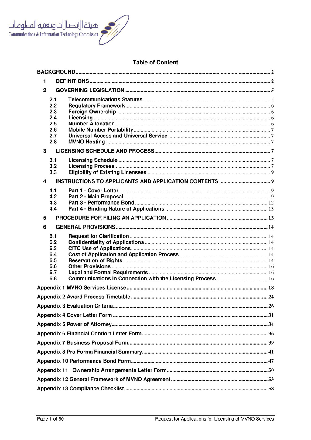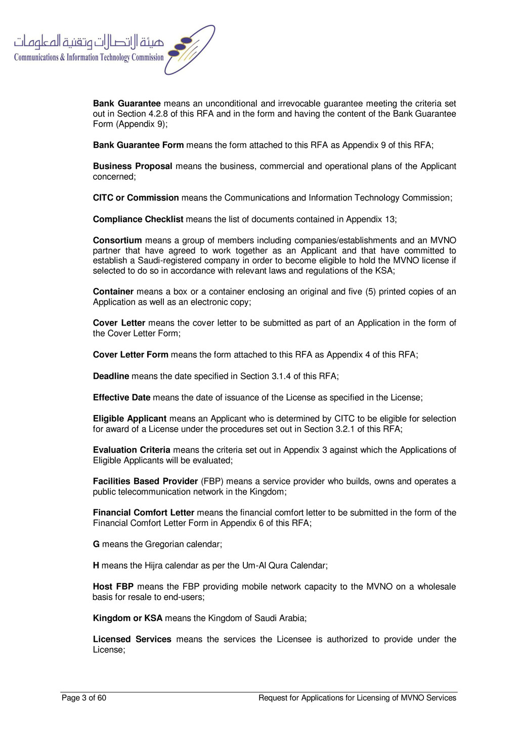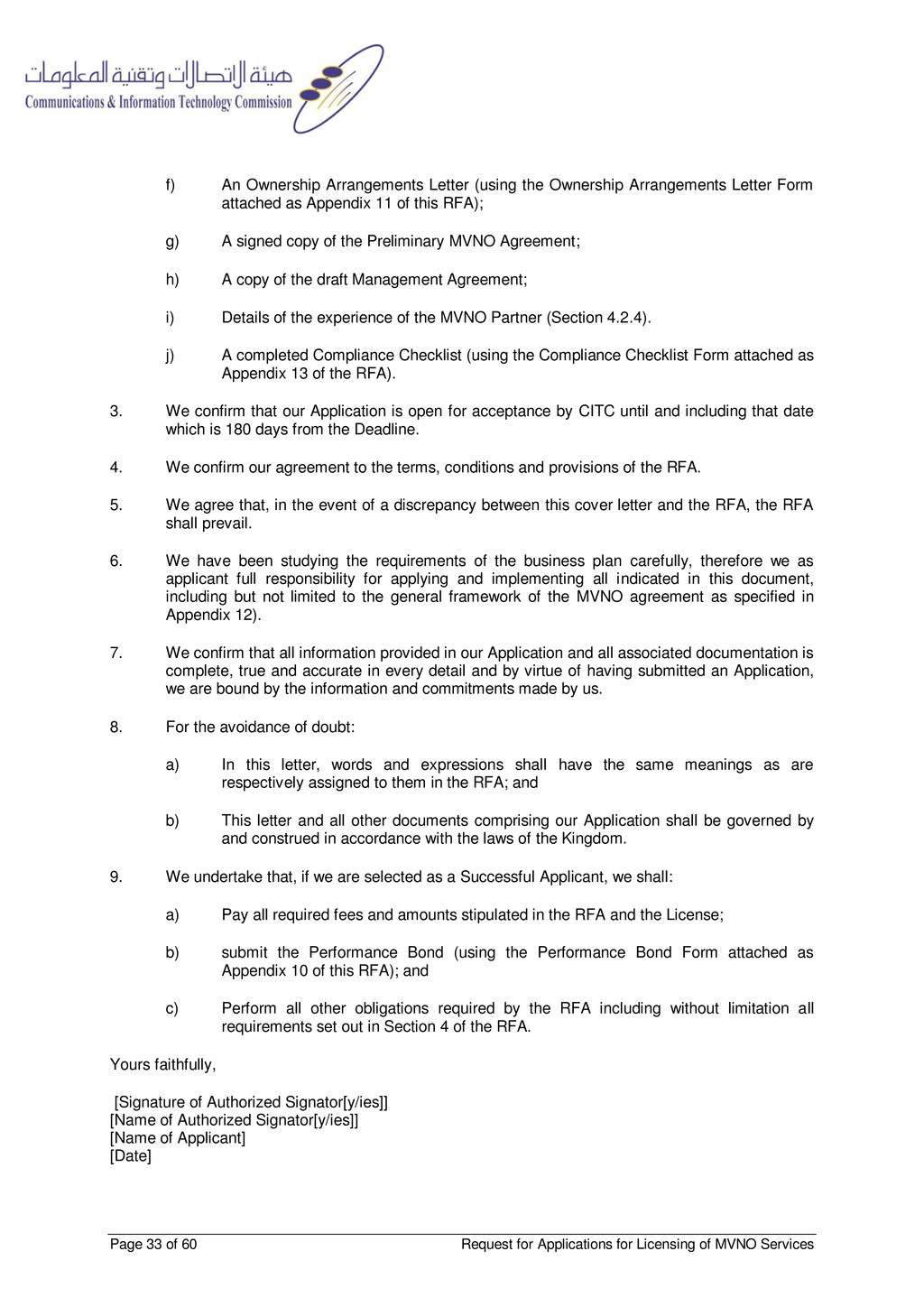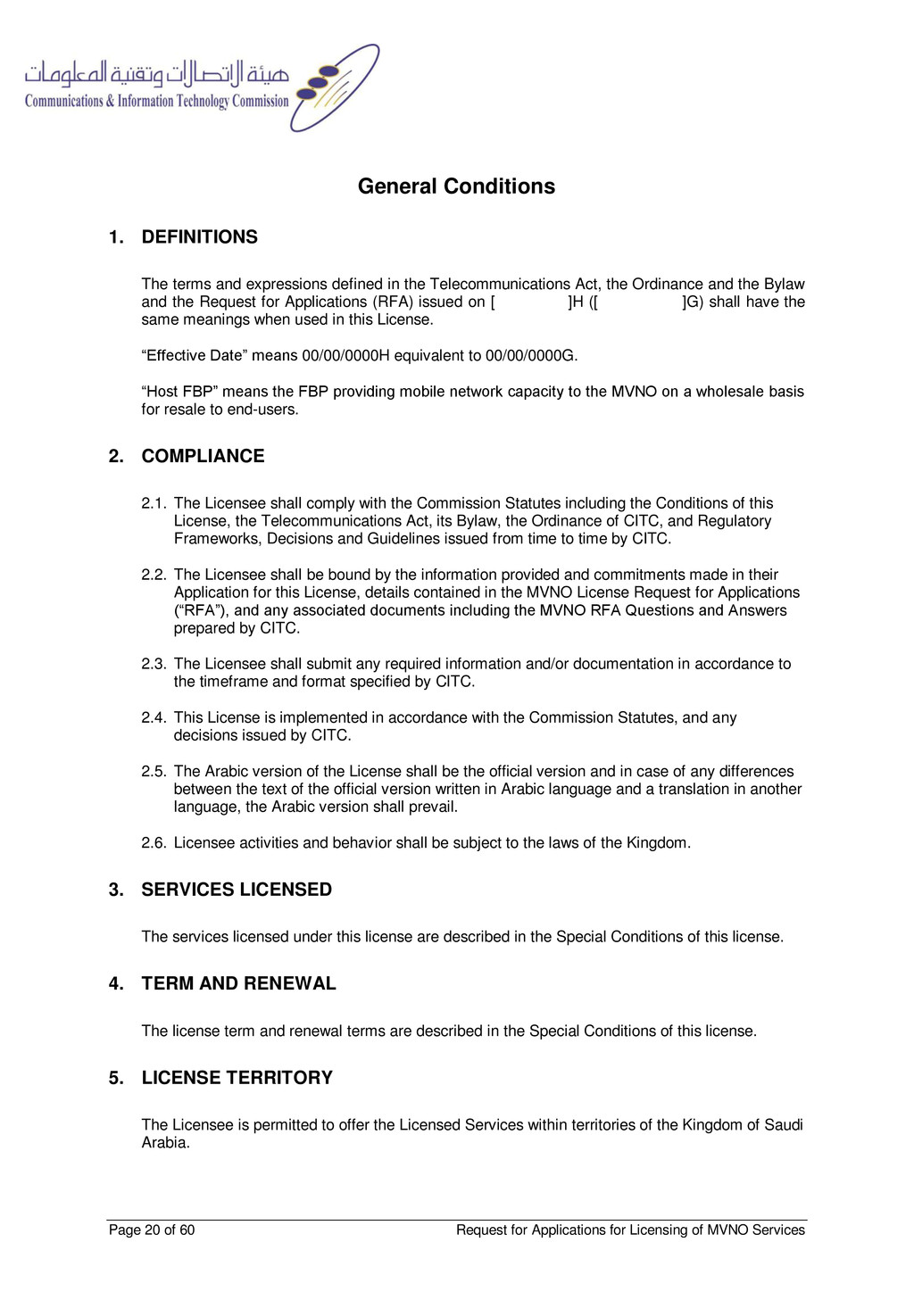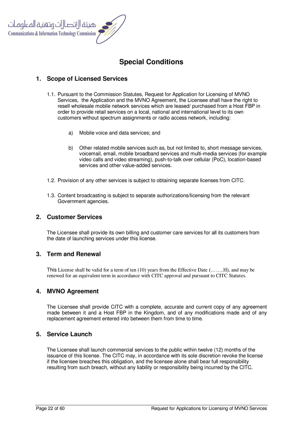 MVNO Services to applicable copyright rules and regulations of the KSA. The information contained in this RFA or subsequently provided to Applicants, whether orally or in documentary form by or on behalf of CITC or any of its employees or Advisors, is provided to Applicants on the terms and conditions set out in this document. 6.5.2 This RFA is not an agreement and does not constitute an offer by CITC to any other party. This RFA does not purport to contain all the information each Applicant may require. It is not the role of CITC, its employees or Advisors to consider the investment objectives, financial situation and particular needs of each Applicant who obtains this RFA. CITC has made reasonable efforts to include accurate and current information in this RFA and in any other documentation provided to Applicants. However, no representation or warranty, expressed or implied, is made by CITC or its employees or by any of its Advisors as to the accuracy, reliability or completeness of the information provided and neither CITC and its employees nor any of its Advisors shall have any liability whatsoever to any Applicants or, where applicable, to any of their Consortium members, owners or shareholders or any other person resulting from use of or reliance on any of the information so provided. Each Applicant should conduct its own investigations and analysis and should check the accuracy, reliability and completeness of the information set out in this RFA and obtain independent advice from appropriate sources prior to use of or reliance on that information. 6.5.3 Notwithstanding any other provisions in this RFA, for whatever reason and without incurring any costs or liabilities or any obligation to inform the Applicants of the reasons for its actions, CITC reserves the absolute and unfettered right, in its sole discretion: a) To take any action, including amending, updating and supplementing this RFA and any other CITC documents, which it considers necessary to ensure that the licensing process occurs in a fair, open and transparent manner, in accordance with the laws of the Kingdom and so as to meet the objectives of CITC; b) To modify the licensing process set out in this RFA and any other CITC documents; c) To accept or reject any Application and to waive any minor informalities or defects in Applications received; d) To reject any Applicant or Application which CITC reasonably believes may pose a risk to national security, safety or scarce resources or which, following the award of a license, may lead to an anti-competitive environment in the market for public telecommunications services in the Kingdom; e) To annul, postpone and/or terminate the licensing process or revoke an award of License at any time before the License is actually issued without any liability on CITC; and f) To accept or not accept any one or more Applicants who have filed an Application. 6.5.4 CITC is not legally obliged to select any Applicant as a Successful Applicant, or to issue a License to any Applicant. 6.5.5 Neither the Government of the KSA nor any of its agencies, employees, representatives, advisors or consultants, including CITC and its Advisors, shall incur any liability whatsoever to any Applicant or, where applicable, to any of its owners or shareholders or any other person by reason of any Decision made or action taken by