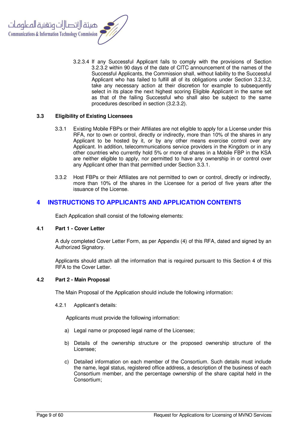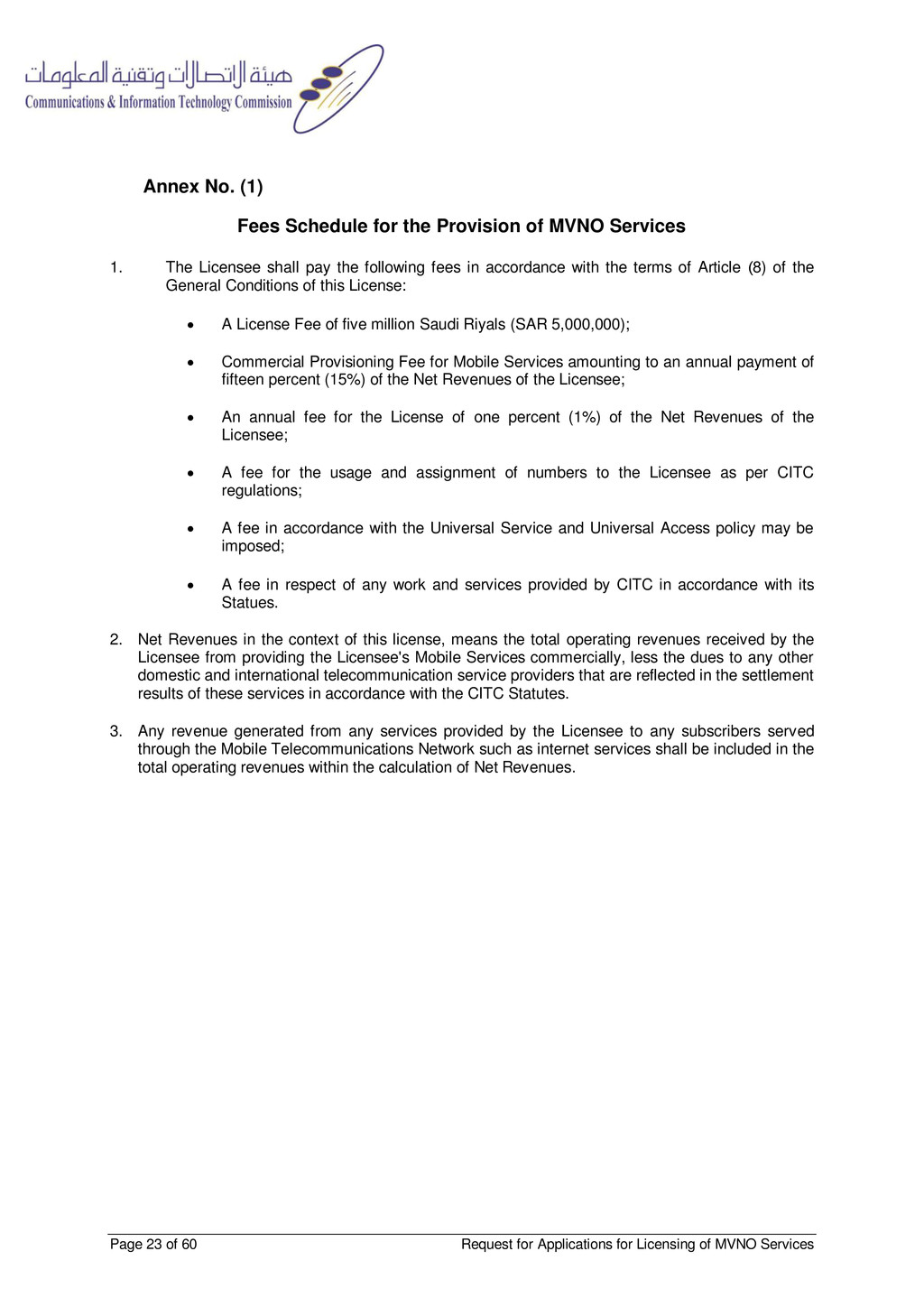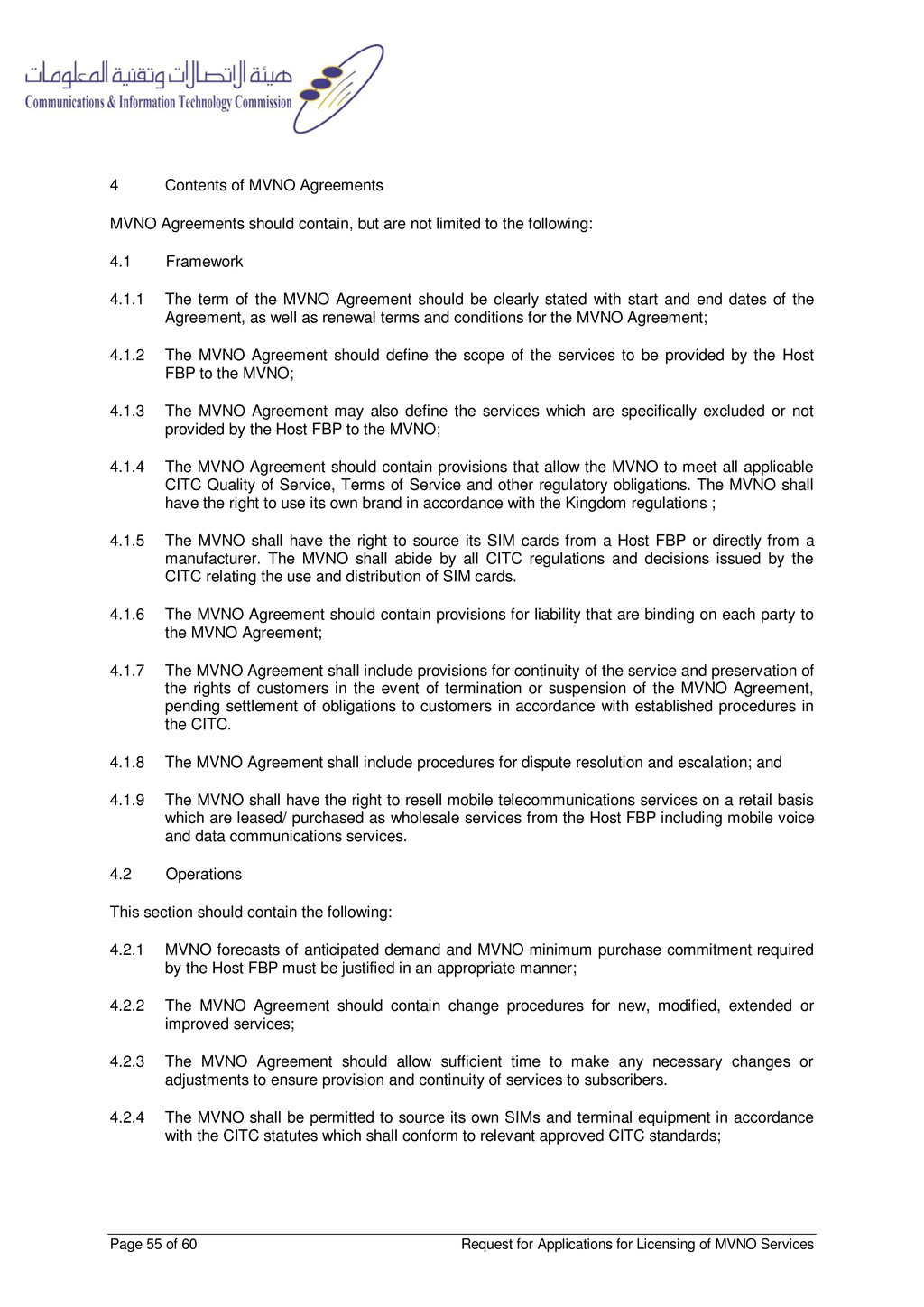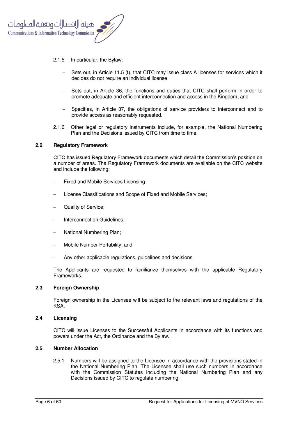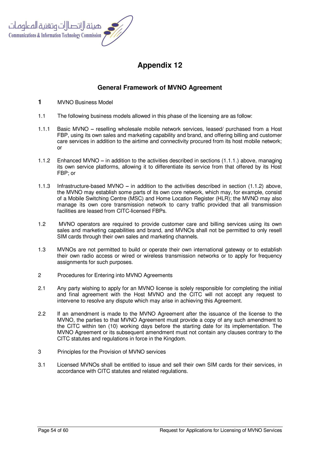 MVNO Services to applicable copyright rules and regulations of the KSA. The information contained in this RFA or subsequently provided to Applicants, whether orally or in documentary form by or on behalf of CITC or any of its employees or Advisors, is provided to Applicants on the terms and conditions set out in this document. 6.5.2 This RFA is not an agreement and does not constitute an offer by CITC to any other party. This RFA does not purport to contain all the information each Applicant may require. It is not the role of CITC, its employees or Advisors to consider the investment objectives, financial situation and particular needs of each Applicant who obtains this RFA. CITC has made reasonable efforts to include accurate and current information in this RFA and in any other documentation provided to Applicants. However, no representation or warranty, expressed or implied, is made by CITC or its employees or by any of its Advisors as to the accuracy, reliability or completeness of the information provided and neither CITC and its employees nor any of its Advisors shall have any liability whatsoever to any Applicants or, where applicable, to any of their Consortium members, owners or shareholders or any other person resulting from use of or reliance on any of the information so provided. Each Applicant should conduct its own investigations and analysis and should check the accuracy, reliability and completeness of the information set out in this RFA and obtain independent advice from appropriate sources prior to use of or reliance on that information. 6.5.3 Notwithstanding any other provisions in this RFA, for whatever reason and without incurring any costs or liabilities or any obligation to inform the Applicants of the reasons for its actions, CITC reserves the absolute and unfettered right, in its sole discretion: a) To take any action, including amending, updating and supplementing this RFA and any other CITC documents, which it considers necessary to ensure that the licensing process occurs in a fair, open and transparent manner, in accordance with the laws of the Kingdom and so as to meet the objectives of CITC; b) To modify the licensing process set out in this RFA and any other CITC documents; c) To accept or reject any Application and to waive any minor informalities or defects in Applications received; d) To reject any Applicant or Application which CITC reasonably believes may pose a risk to national security, safety or scarce resources or which, following the award of a license, may lead to an anti-competitive environment in the market for public telecommunications services in the Kingdom; e) To annul, postpone and/or terminate the licensing process or revoke an award of License at any time before the License is actually issued without any liability on CITC; and f) To accept or not accept any one or more Applicants who have filed an Application. 6.5.4 CITC is not legally obliged to select any Applicant as a Successful Applicant, or to issue a License to any Applicant. 6.5.5 Neither the Government of the KSA nor any of its agencies, employees, representatives, advisors or consultants, including CITC and its Advisors, shall incur any liability whatsoever to any Applicant or, where applicable, to any of its owners or shareholders or any other person by reason of any Decision made or action taken by