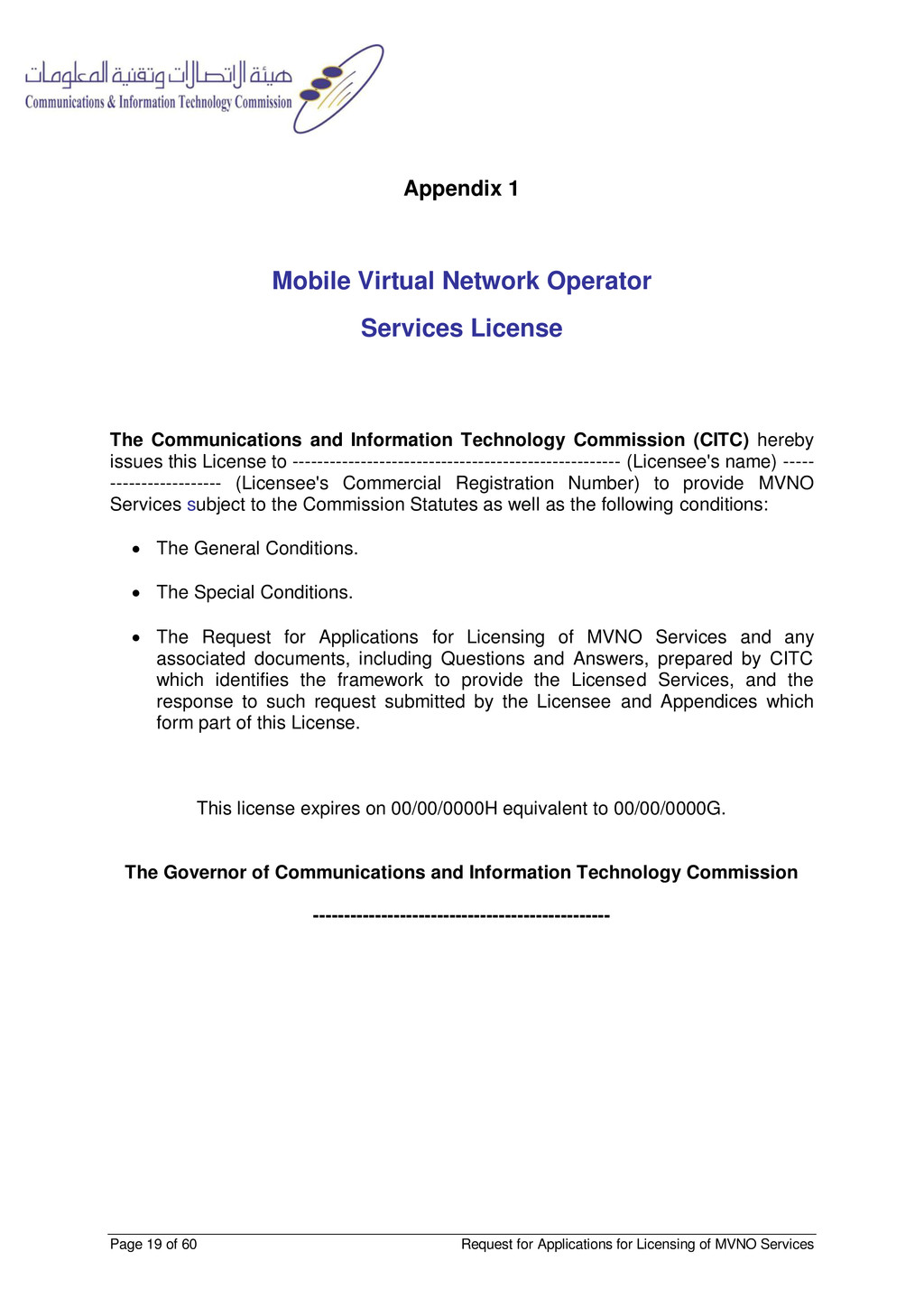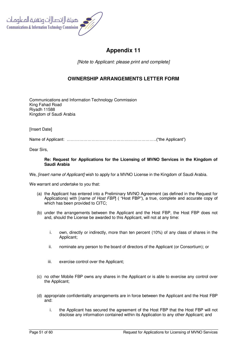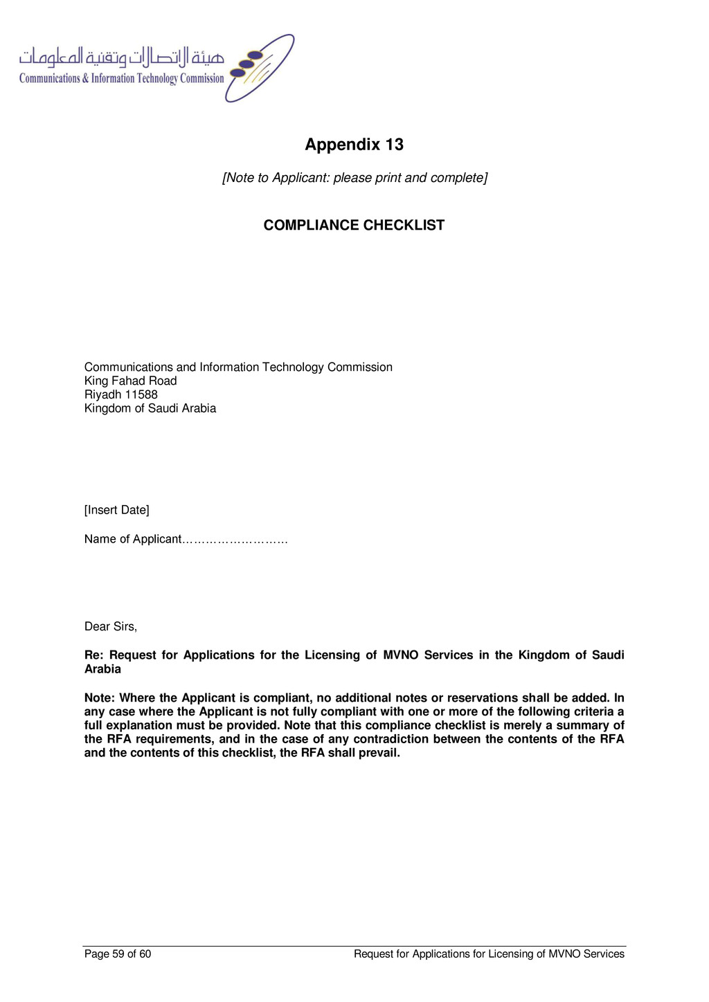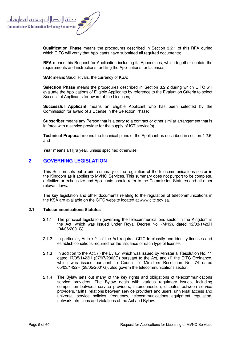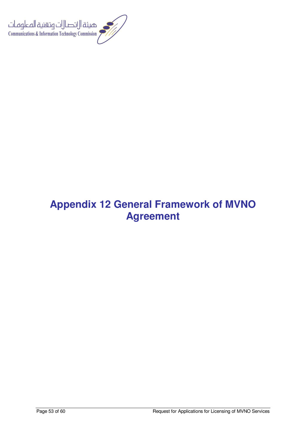 MVNO Services to applicable copyright rules and regulations of the KSA. The information contained in this RFA or subsequently provided to Applicants, whether orally or in documentary form by or on behalf of CITC or any of its employees or Advisors, is provided to Applicants on the terms and conditions set out in this document. 6.5.2 This RFA is not an agreement and does not constitute an offer by CITC to any other party. This RFA does not purport to contain all the information each Applicant may require. It is not the role of CITC, its employees or Advisors to consider the investment objectives, financial situation and particular needs of each Applicant who obtains this RFA. CITC has made reasonable efforts to include accurate and current information in this RFA and in any other documentation provided to Applicants. However, no representation or warranty, expressed or implied, is made by CITC or its employees or by any of its Advisors as to the accuracy, reliability or completeness of the information provided and neither CITC and its employees nor any of its Advisors shall have any liability whatsoever to any Applicants or, where applicable, to any of their Consortium members, owners or shareholders or any other person resulting from use of or reliance on any of the information so provided. Each Applicant should conduct its own investigations and analysis and should check the accuracy, reliability and completeness of the information set out in this RFA and obtain independent advice from appropriate sources prior to use of or reliance on that information. 6.5.3 Notwithstanding any other provisions in this RFA, for whatever reason and without incurring any costs or liabilities or any obligation to inform the Applicants of the reasons for its actions, CITC reserves the absolute and unfettered right, in its sole discretion: a) To take any action, including amending, updating and supplementing this RFA and any other CITC documents, which it considers necessary to ensure that the licensing process occurs in a fair, open and transparent manner, in accordance with the laws of the Kingdom and so as to meet the objectives of CITC; b) To modify the licensing process set out in this RFA and any other CITC documents; c) To accept or reject any Application and to waive any minor informalities or defects in Applications received; d) To reject any Applicant or Application which CITC reasonably believes may pose a risk to national security, safety or scarce resources or which, following the award of a license, may lead to an anti-competitive environment in the market for public telecommunications services in the Kingdom; e) To annul, postpone and/or terminate the licensing process or revoke an award of License at any time before the License is actually issued without any liability on CITC; and f) To accept or not accept any one or more Applicants who have filed an Application. 6.5.4 CITC is not legally obliged to select any Applicant as a Successful Applicant, or to issue a License to any Applicant. 6.5.5 Neither the Government of the KSA nor any of its agencies, employees, representatives, advisors or consultants, including CITC and its Advisors, shall incur any liability whatsoever to any Applicant or, where applicable, to any of its owners or shareholders or any other person by reason of any Decision made or action taken by