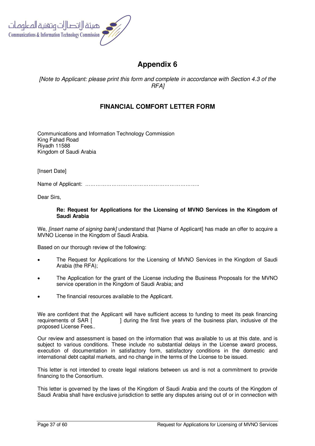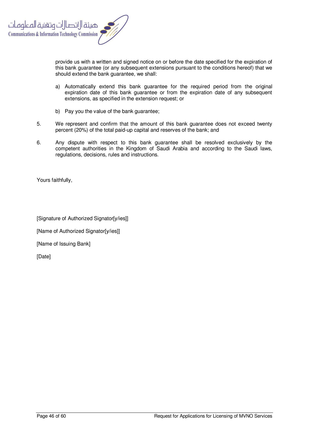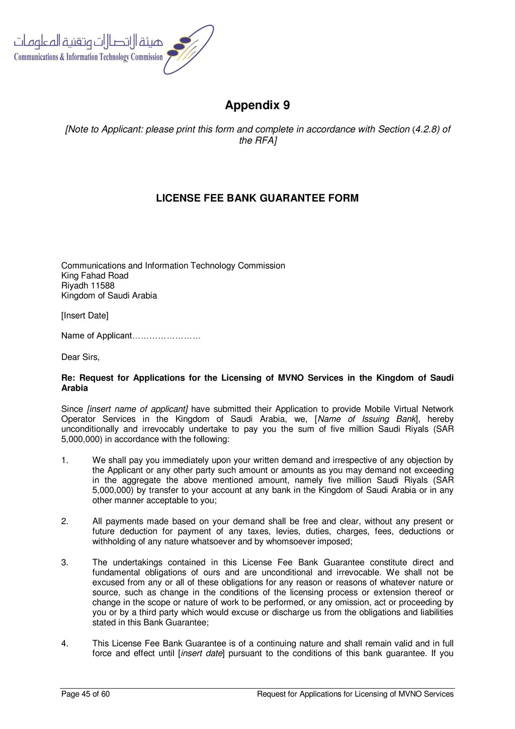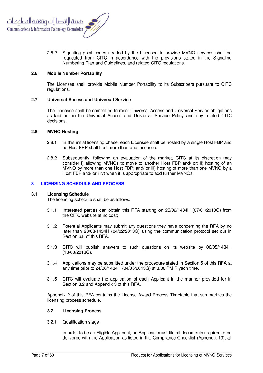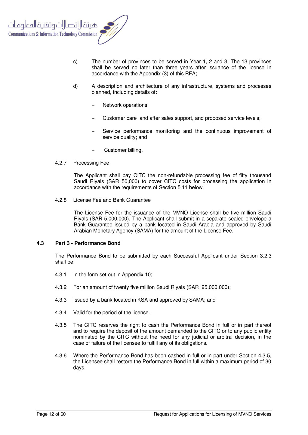 MVNO Services to applicable copyright rules and regulations of the KSA. The information contained in this RFA or subsequently provided to Applicants, whether orally or in documentary form by or on behalf of CITC or any of its employees or Advisors, is provided to Applicants on the terms and conditions set out in this document. 6.5.2 This RFA is not an agreement and does not constitute an offer by CITC to any other party. This RFA does not purport to contain all the information each Applicant may require. It is not the role of CITC, its employees or Advisors to consider the investment objectives, financial situation and particular needs of each Applicant who obtains this RFA. CITC has made reasonable efforts to include accurate and current information in this RFA and in any other documentation provided to Applicants. However, no representation or warranty, expressed or implied, is made by CITC or its employees or by any of its Advisors as to the accuracy, reliability or completeness of the information provided and neither CITC and its employees nor any of its Advisors shall have any liability whatsoever to any Applicants or, where applicable, to any of their Consortium members, owners or shareholders or any other person resulting from use of or reliance on any of the information so provided. Each Applicant should conduct its own investigations and analysis and should check the accuracy, reliability and completeness of the information set out in this RFA and obtain independent advice from appropriate sources prior to use of or reliance on that information. 6.5.3 Notwithstanding any other provisions in this RFA, for whatever reason and without incurring any costs or liabilities or any obligation to inform the Applicants of the reasons for its actions, CITC reserves the absolute and unfettered right, in its sole discretion: a) To take any action, including amending, updating and supplementing this RFA and any other CITC documents, which it considers necessary to ensure that the licensing process occurs in a fair, open and transparent manner, in accordance with the laws of the Kingdom and so as to meet the objectives of CITC; b) To modify the licensing process set out in this RFA and any other CITC documents; c) To accept or reject any Application and to waive any minor informalities or defects in Applications received; d) To reject any Applicant or Application which CITC reasonably believes may pose a risk to national security, safety or scarce resources or which, following the award of a license, may lead to an anti-competitive environment in the market for public telecommunications services in the Kingdom; e) To annul, postpone and/or terminate the licensing process or revoke an award of License at any time before the License is actually issued without any liability on CITC; and f) To accept or not accept any one or more Applicants who have filed an Application. 6.5.4 CITC is not legally obliged to select any Applicant as a Successful Applicant, or to issue a License to any Applicant. 6.5.5 Neither the Government of the KSA nor any of its agencies, employees, representatives, advisors or consultants, including CITC and its Advisors, shall incur any liability whatsoever to any Applicant or, where applicable, to any of its owners or shareholders or any other person by reason of any Decision made or action taken by