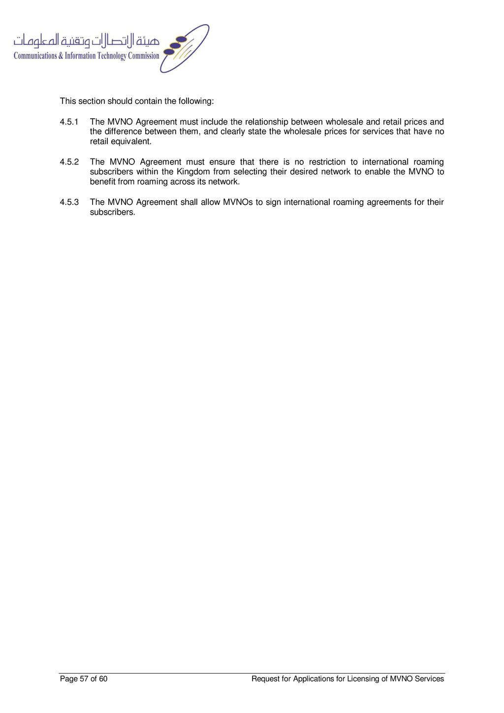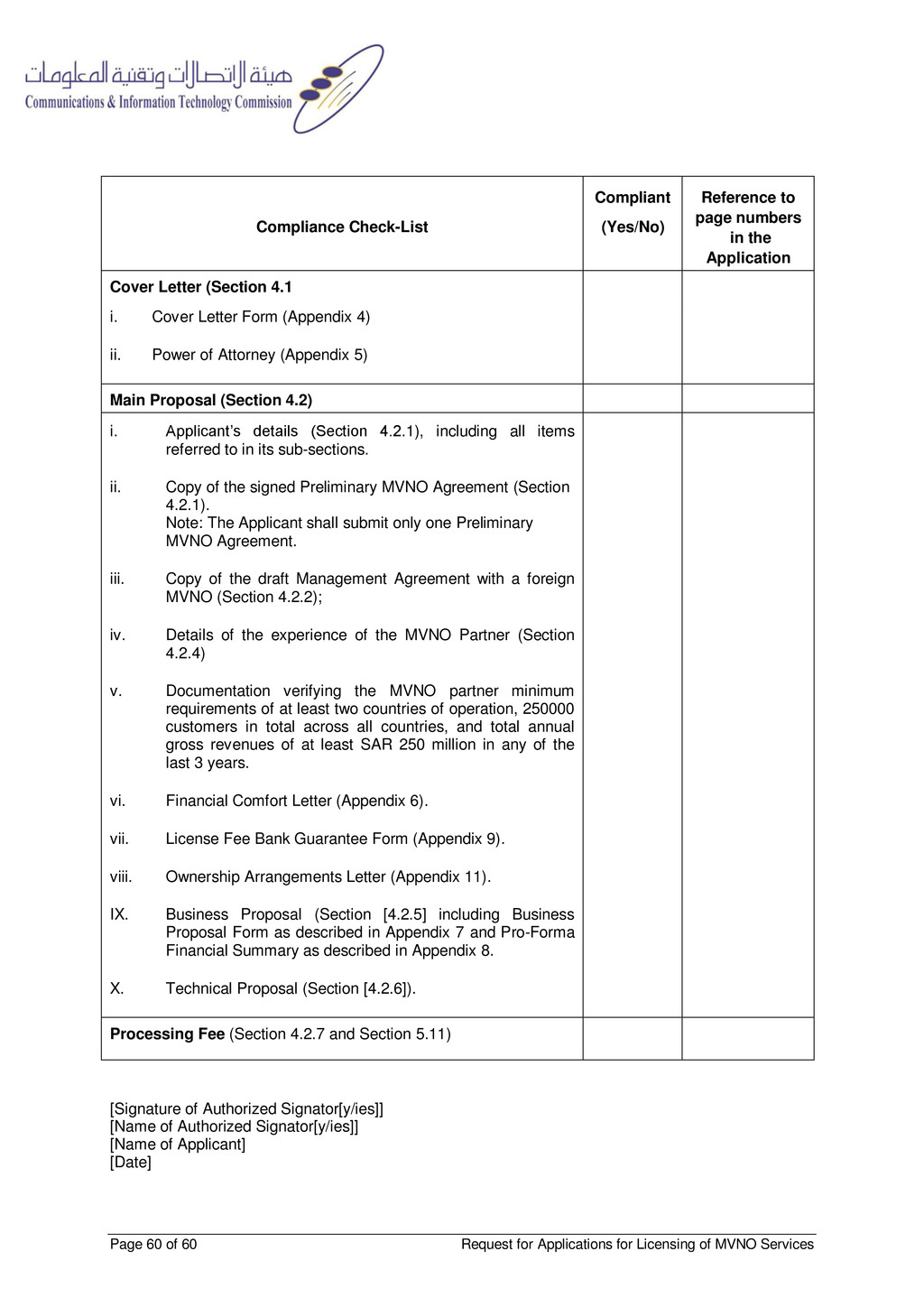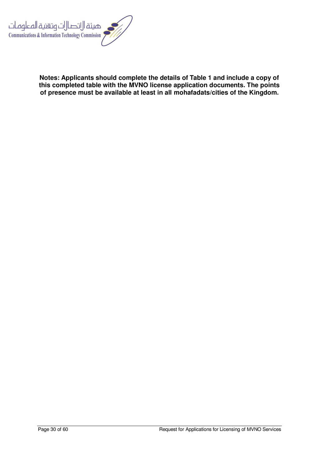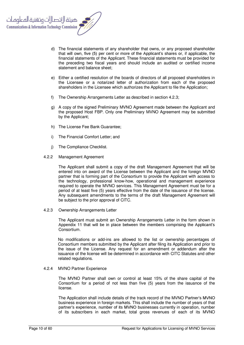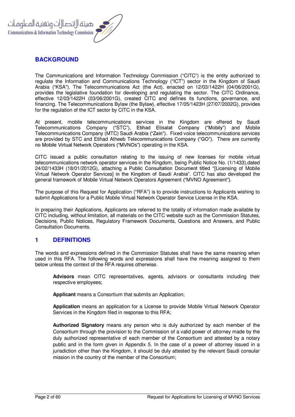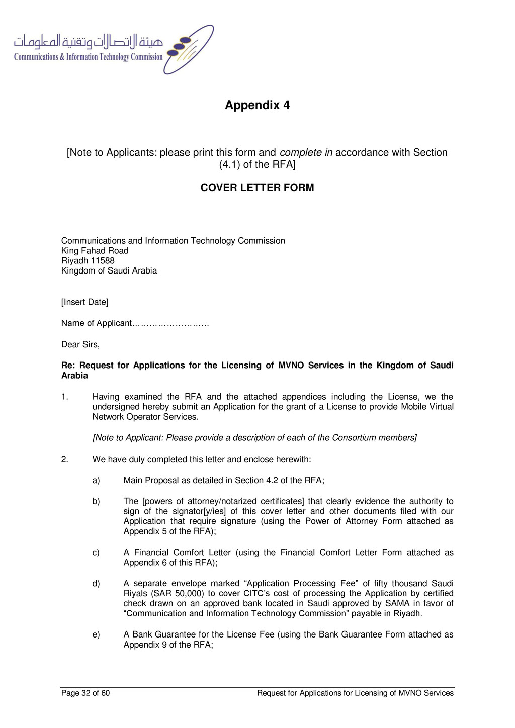 MVNO Services to applicable copyright rules and regulations of the KSA. The information contained in this RFA or subsequently provided to Applicants, whether orally or in documentary form by or on behalf of CITC or any of its employees or Advisors, is provided to Applicants on the terms and conditions set out in this document. 6.5.2 This RFA is not an agreement and does not constitute an offer by CITC to any other party. This RFA does not purport to contain all the information each Applicant may require. It is not the role of CITC, its employees or Advisors to consider the investment objectives, financial situation and particular needs of each Applicant who obtains this RFA. CITC has made reasonable efforts to include accurate and current information in this RFA and in any other documentation provided to Applicants. However, no representation or warranty, expressed or implied, is made by CITC or its employees or by any of its Advisors as to the accuracy, reliability or completeness of the information provided and neither CITC and its employees nor any of its Advisors shall have any liability whatsoever to any Applicants or, where applicable, to any of their Consortium members, owners or shareholders or any other person resulting from use of or reliance on any of the information so provided. Each Applicant should conduct its own investigations and analysis and should check the accuracy, reliability and completeness of the information set out in this RFA and obtain independent advice from appropriate sources prior to use of or reliance on that information. 6.5.3 Notwithstanding any other provisions in this RFA, for whatever reason and without incurring any costs or liabilities or any obligation to inform the Applicants of the reasons for its actions, CITC reserves the absolute and unfettered right, in its sole discretion: a) To take any action, including amending, updating and supplementing this RFA and any other CITC documents, which it considers necessary to ensure that the licensing process occurs in a fair, open and transparent manner, in accordance with the laws of the Kingdom and so as to meet the objectives of CITC; b) To modify the licensing process set out in this RFA and any other CITC documents; c) To accept or reject any Application and to waive any minor informalities or defects in Applications received; d) To reject any Applicant or Application which CITC reasonably believes may pose a risk to national security, safety or scarce resources or which, following the award of a license, may lead to an anti-competitive environment in the market for public telecommunications services in the Kingdom; e) To annul, postpone and/or terminate the licensing process or revoke an award of License at any time before the License is actually issued without any liability on CITC; and f) To accept or not accept any one or more Applicants who have filed an Application. 6.5.4 CITC is not legally obliged to select any Applicant as a Successful Applicant, or to issue a License to any Applicant. 6.5.5 Neither the Government of the KSA nor any of its agencies, employees, representatives, advisors or consultants, including CITC and its Advisors, shall incur any liability whatsoever to any Applicant or, where applicable, to any of its owners or shareholders or any other person by reason of any Decision made or action taken by