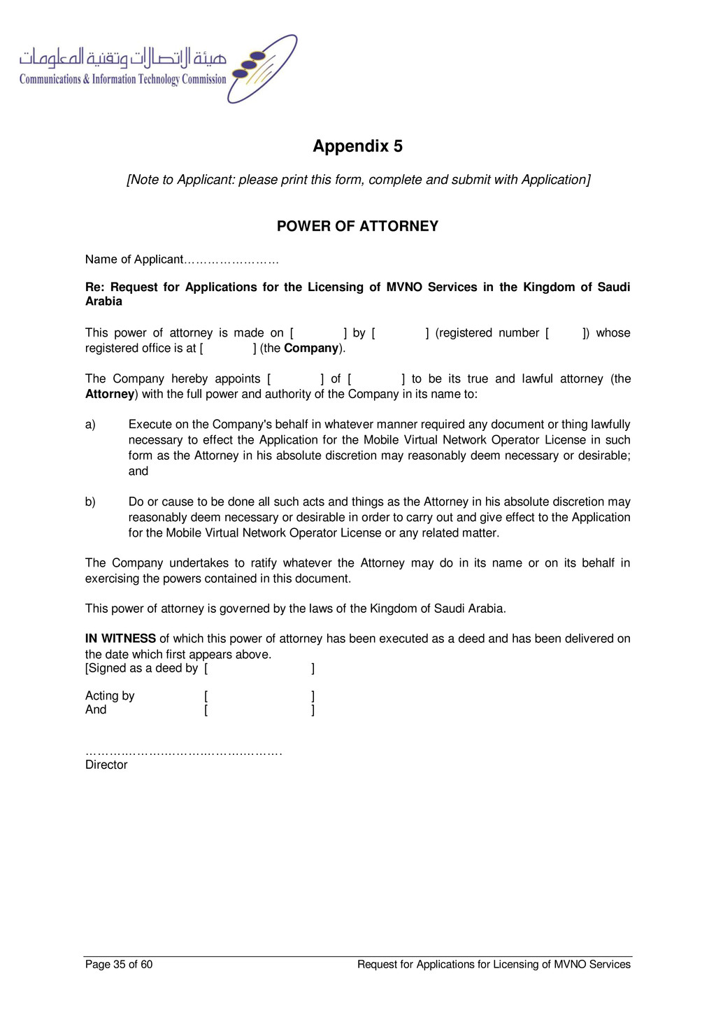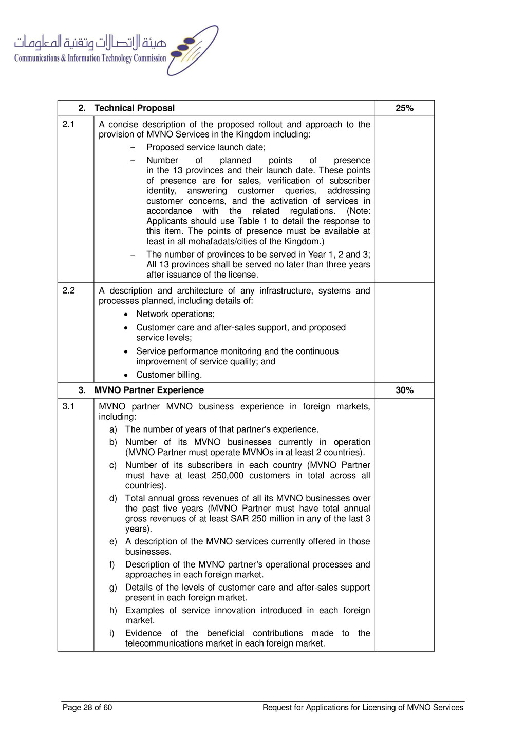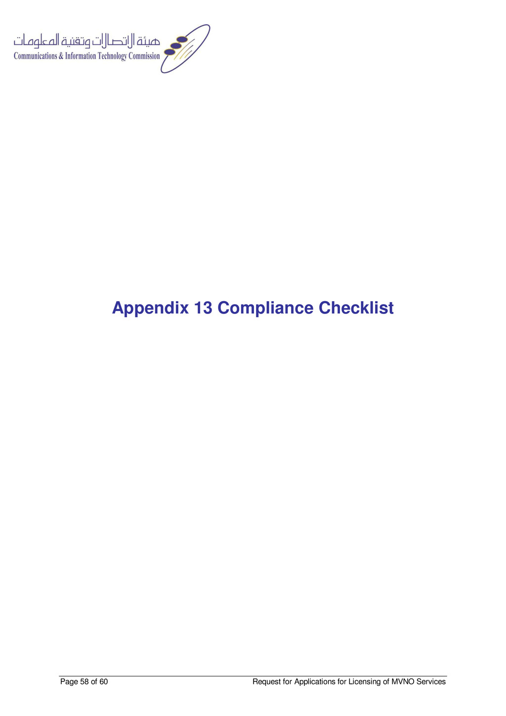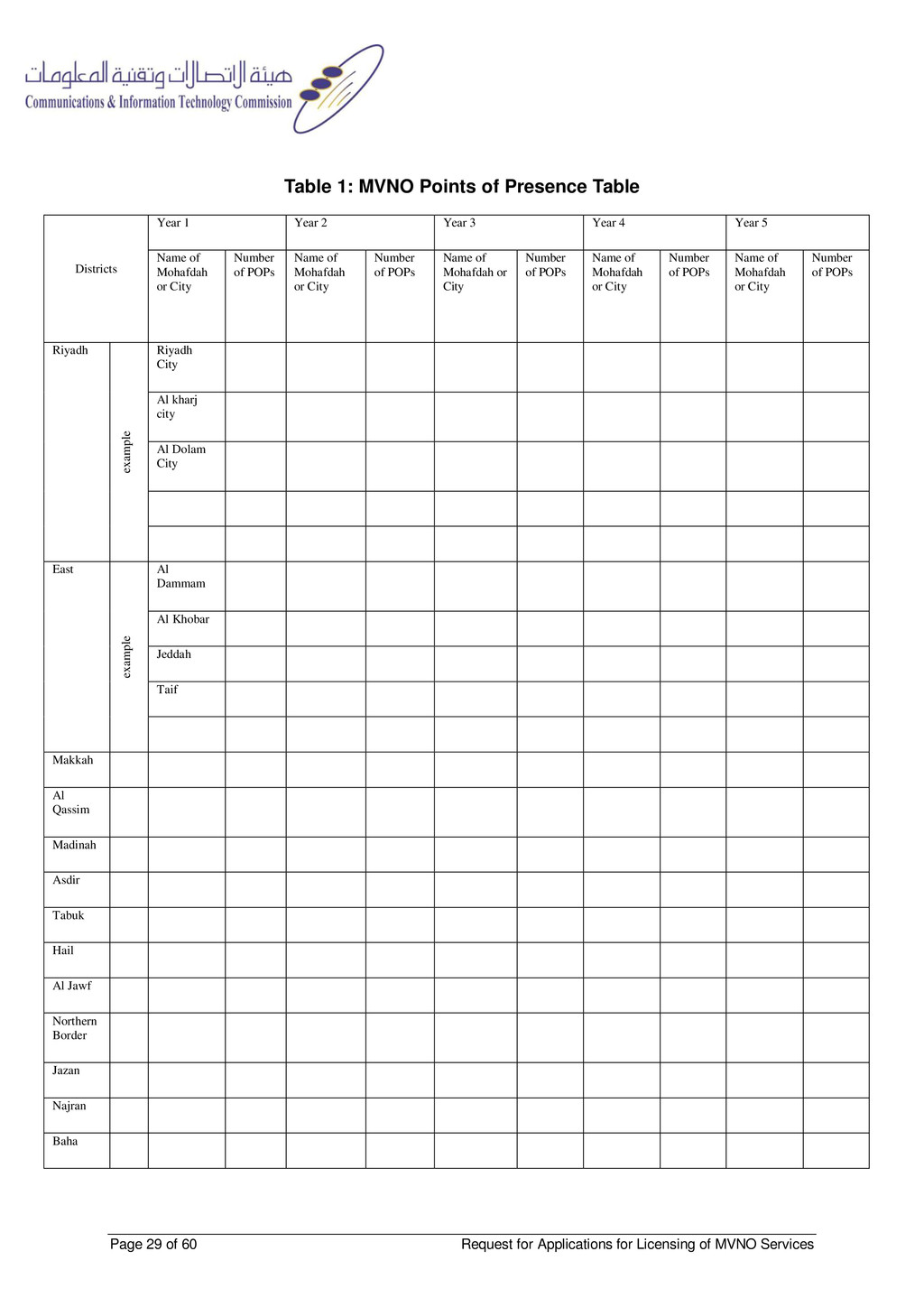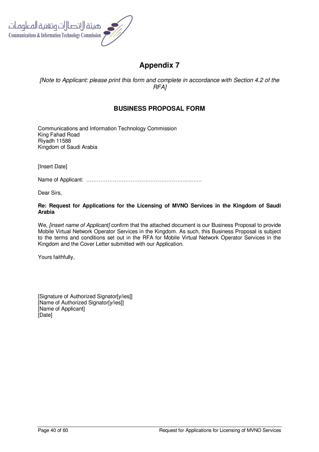 MVNO Services to applicable copyright rules and regulations of the KSA. The information contained in this RFA or subsequently provided to Applicants, whether orally or in documentary form by or on behalf of CITC or any of its employees or Advisors, is provided to Applicants on the terms and conditions set out in this document. 6.5.2 This RFA is not an agreement and does not constitute an offer by CITC to any other party. This RFA does not purport to contain all the information each Applicant may require. It is not the role of CITC, its employees or Advisors to consider the investment objectives, financial situation and particular needs of each Applicant who obtains this RFA. CITC has made reasonable efforts to include accurate and current information in this RFA and in any other documentation provided to Applicants. However, no representation or warranty, expressed or implied, is made by CITC or its employees or by any of its Advisors as to the accuracy, reliability or completeness of the information provided and neither CITC and its employees nor any of its Advisors shall have any liability whatsoever to any Applicants or, where applicable, to any of their Consortium members, owners or shareholders or any other person resulting from use of or reliance on any of the information so provided. Each Applicant should conduct its own investigations and analysis and should check the accuracy, reliability and completeness of the information set out in this RFA and obtain independent advice from appropriate sources prior to use of or reliance on that information. 6.5.3 Notwithstanding any other provisions in this RFA, for whatever reason and without incurring any costs or liabilities or any obligation to inform the Applicants of the reasons for its actions, CITC reserves the absolute and unfettered right, in its sole discretion: a) To take any action, including amending, updating and supplementing this RFA and any other CITC documents, which it considers necessary to ensure that the licensing process occurs in a fair, open and transparent manner, in accordance with the laws of the Kingdom and so as to meet the objectives of CITC; b) To modify the licensing process set out in this RFA and any other CITC documents; c) To accept or reject any Application and to waive any minor informalities or defects in Applications received; d) To reject any Applicant or Application which CITC reasonably believes may pose a risk to national security, safety or scarce resources or which, following the award of a license, may lead to an anti-competitive environment in the market for public telecommunications services in the Kingdom; e) To annul, postpone and/or terminate the licensing process or revoke an award of License at any time before the License is actually issued without any liability on CITC; and f) To accept or not accept any one or more Applicants who have filed an Application. 6.5.4 CITC is not legally obliged to select any Applicant as a Successful Applicant, or to issue a License to any Applicant. 6.5.5 Neither the Government of the KSA nor any of its agencies, employees, representatives, advisors or consultants, including CITC and its Advisors, shall incur any liability whatsoever to any Applicant or, where applicable, to any of its owners or shareholders or any other person by reason of any Decision made or action taken by